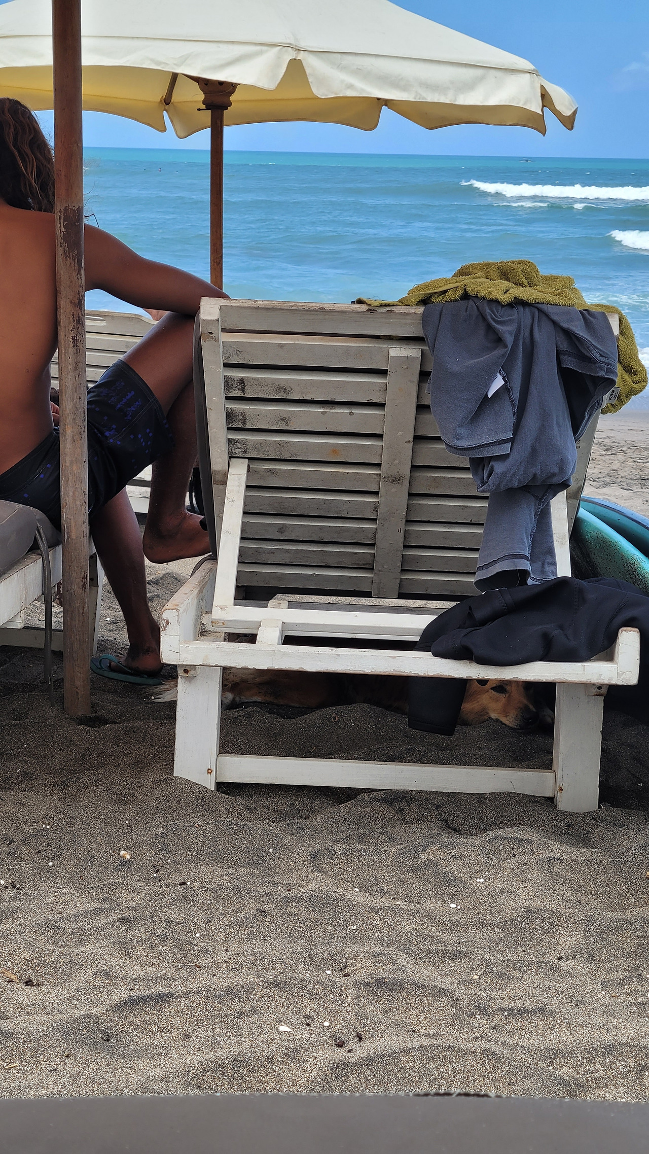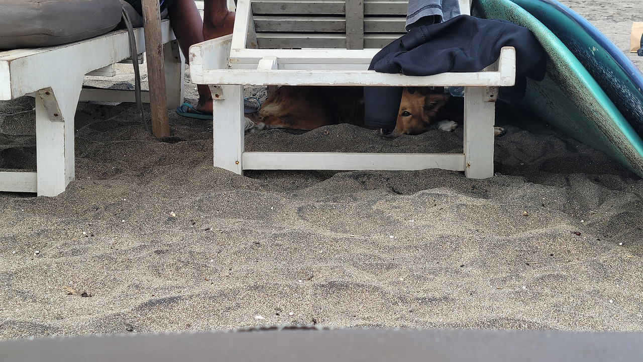 옮겨온 자리 앞쪽은 개 한 마리가 열기를 피해 베드 아래로 기어들어가서 모래를 파고 드러누워 있었다. 꽤 영리해 보였는데 베드 주인이 기르는 개는 아닌 것 같은 게, 사람이 왔다 갔다 하면 불안해하며 나와서는 호시탐탐 다시 들어갈 기회를 엿봤기 때문이다. 베드 옆에 서핑 보드가 두 개나 놓이자 쫓겨나듯 기어 나온 뒤 한참을 못 들어가고 더워서 헥헥거렸다. 들어갈 타이밍이 아무리 봐도 안 나온다 싶던지 녀석은 바다에서 몸을 식히고 돌아와서 30분 정도를 맴돌다가 겨우 다시 자리를 되찾았다.