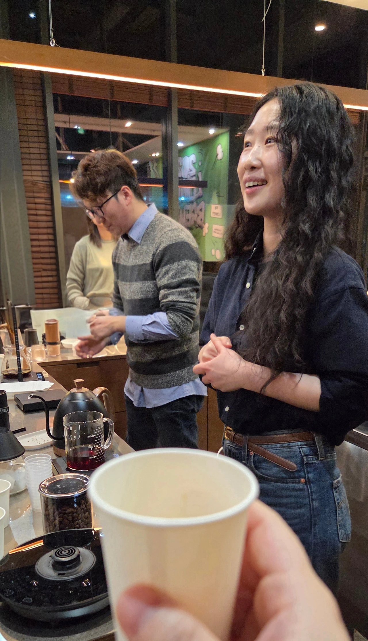 ☕️제가 10년 전에 마신 융드립은 태우듯이 로스팅한 커피의 쓴맛과 오일을 함께 즐기는 에스프레소와 같은 음료였는데요. 로우키에서 로스팅한 원두로 내린 두 분의 융드립 커피는 예전에 마신 커피와도, 두 분이 내린 전혀 달라서 같은 커피를 하는 사람들끼리도 이렇게 결과가 다르구나 감탄했습니다.