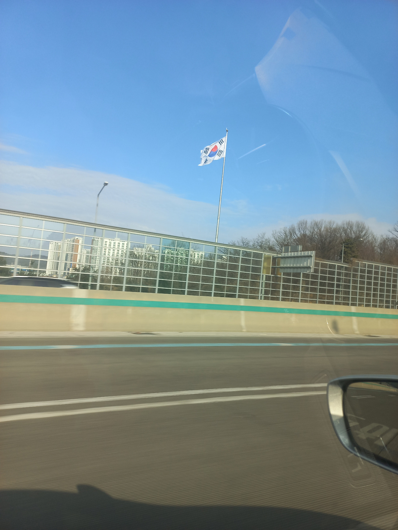 버스를 기다리는데 신호등 넘어 가로등 아래 태극기가 줄 서 있는 것이 보인다