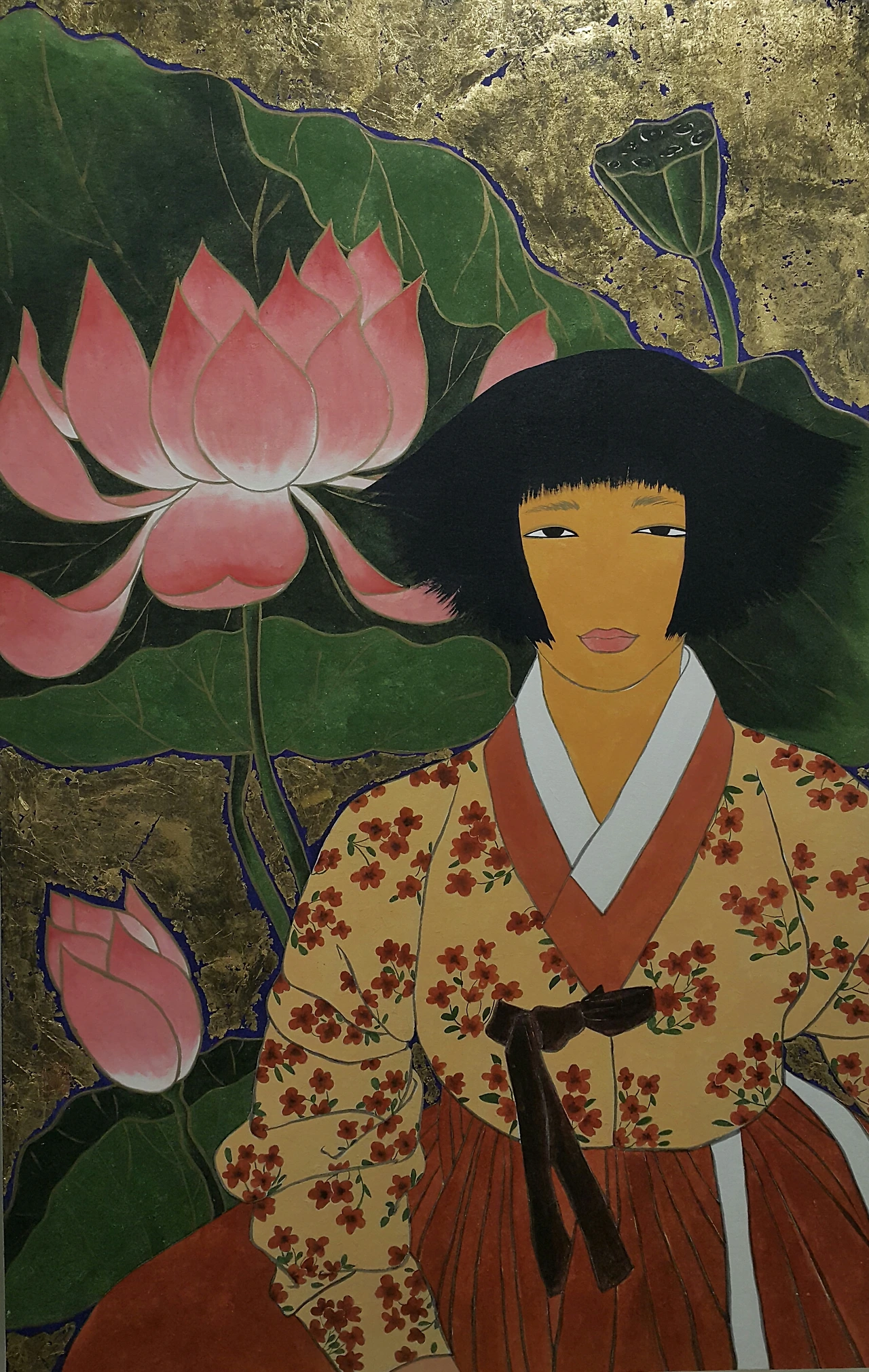 아버지 눈을 뜨게 하려고 공양미 300석에 인당수로 뛰어든 심청이~하지만 하늘이 감동해서 왕비로 다시 신분상승을 시켜주려~ 왕앞에 연꽃속에서 소녀에서 숙녀로 성숙되어 피어났다.하지만 심청이가 선택한 사항이 아니다 그녀에겐 어떠한 선택권도 없었다.단지 그녀의 목적은 아버지를 다시 뵙고 눈을 뜨게 해주고 싶을뿐이다.그리고 아무리 왕이라도 심청이도 나름의 좋아하는 스타일이 있지 않을까? 왕이 그녀의 이상형이 아닐지라도 상관이 없다.그녀의 목표를 이루기엔 왕만한 스펙이 없으니~그녀는 자기의 속내를 감추기 위해 최대한 표정을 지우고 꽃의 아름다움과 옷의 화사함 그리고 후광(진짜금임)으로 자신의 비장함을 숨겼다.그녀의 코를 그리지 않은건 그런 심청의 속내를 감춘것을 표현하고자 함이다.