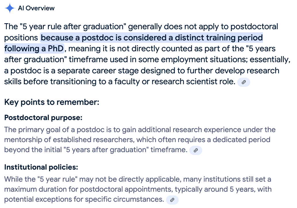 운 좋게도 해당 분야에서 톱 3 안에 드는 대학에서 포닥(Postdoc) 자리를 얻어 미국에서의 생활을 연장할 수 있었다. 하지만 결혼과 함께 향수병이 찾아왔고, Korea Research Fellowship으로 3년간 한국에서 연구한 후 육아휴직 겸 6개월 동안 쉬었다. 이후 다시 초심으로 돌아가 미국 국가 연구소 포닥 자리에 지원했고, 그때 처음으로 "졸업 후 5년룰(5-Year Rule)"라는 개념을 알게 되었다.