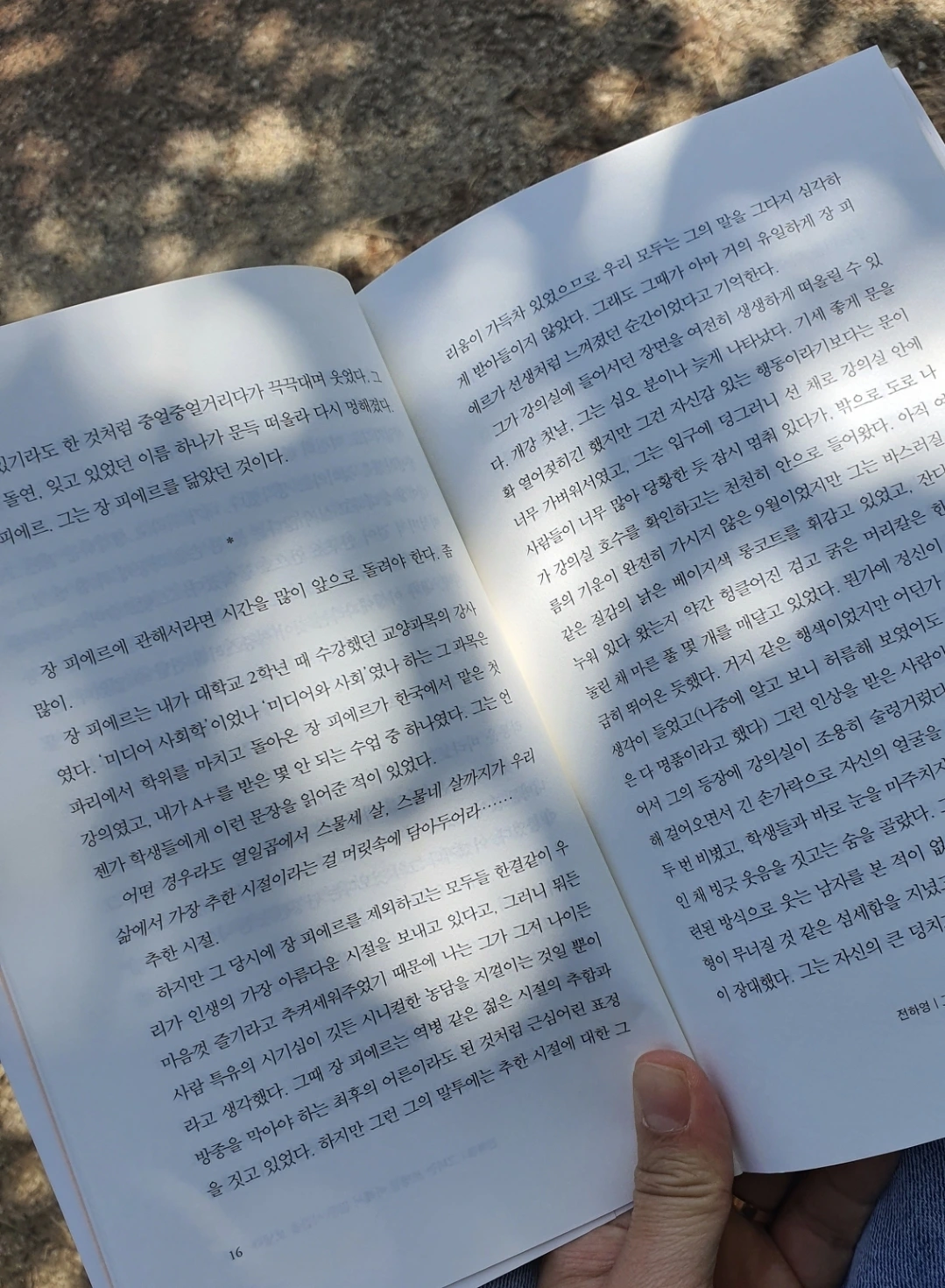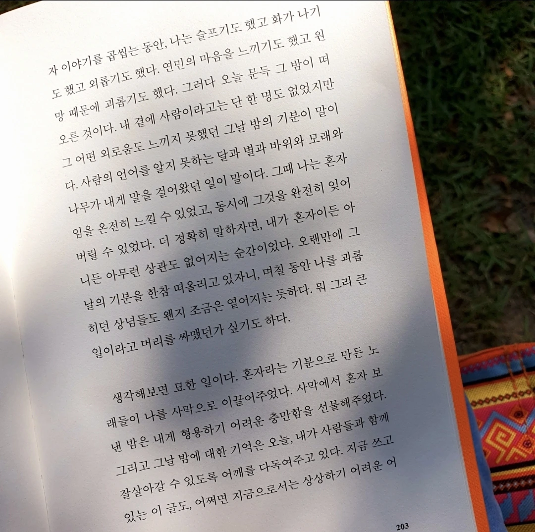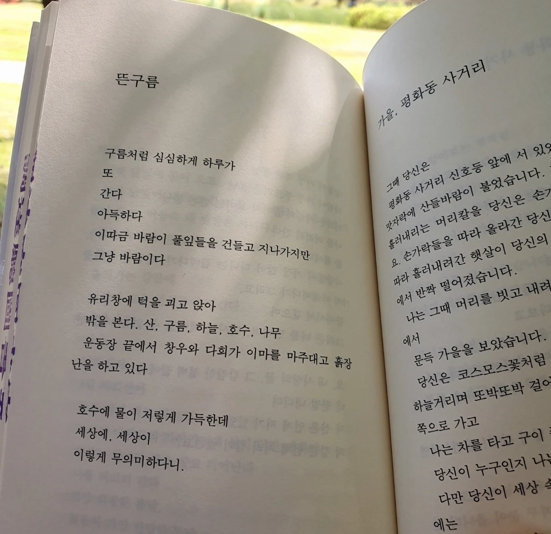 특히 좋아하는 것은 햇빛이 쨍한 날 나뭇잎 그림자와 빛망울이 책 위에 일렁이는 것이다. 글자 위에 춤추는 빛망울을 보고 있으면 그 순간엔 햇빛과 바람과 책과 나만 있는 것처럼 느껴진다. 산책하는 사람들이 앞을 지나가도, 목소리가 들려도 어쩐지 멀리서 들리는 소리같고, 내 정신은 온전히 문장을 느끼고, 책장을 넘길 때의 촉감을 느끼는 데에만 머무는 것 같다.