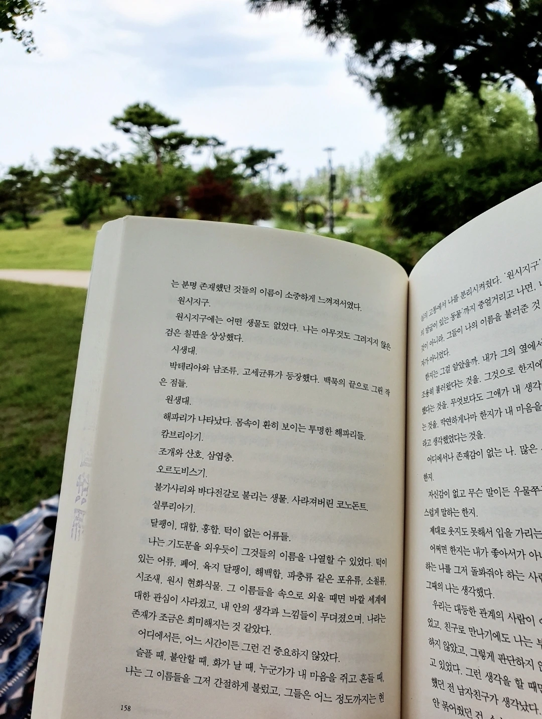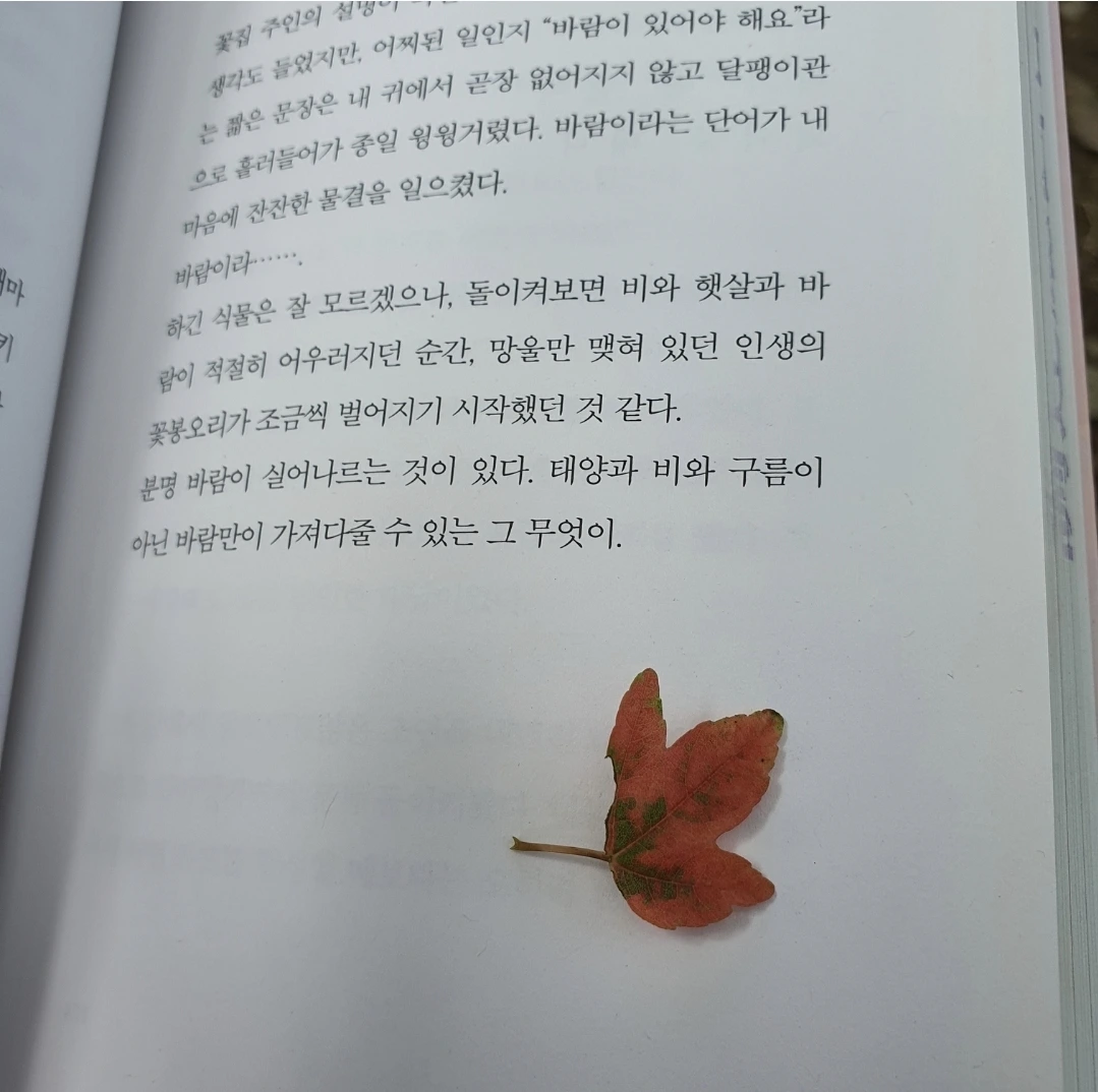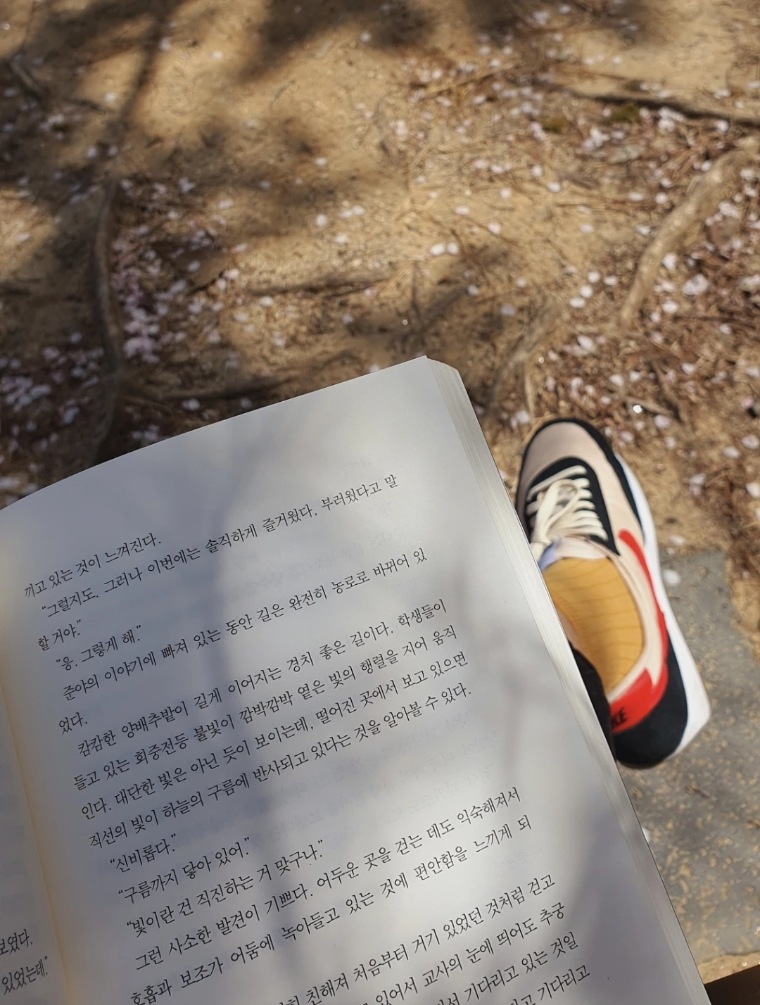 특히 좋아하는 것은 햇빛이 쨍한 날 나뭇잎 그림자와 빛망울이 책 위에 일렁이는 것이다. 글자 위에 춤추는 빛망울을 보고 있으면 그 순간엔 햇빛과 바람과 책과 나만 있는 것처럼 느껴진다. 산책하는 사람들이 앞을 지나가도, 목소리가 들려도 어쩐지 멀리서 들리는 소리같고, 내 정신은 온전히 문장을 느끼고, 책장을 넘길 때의 촉감을 느끼는 데에만 머무는 것 같다.