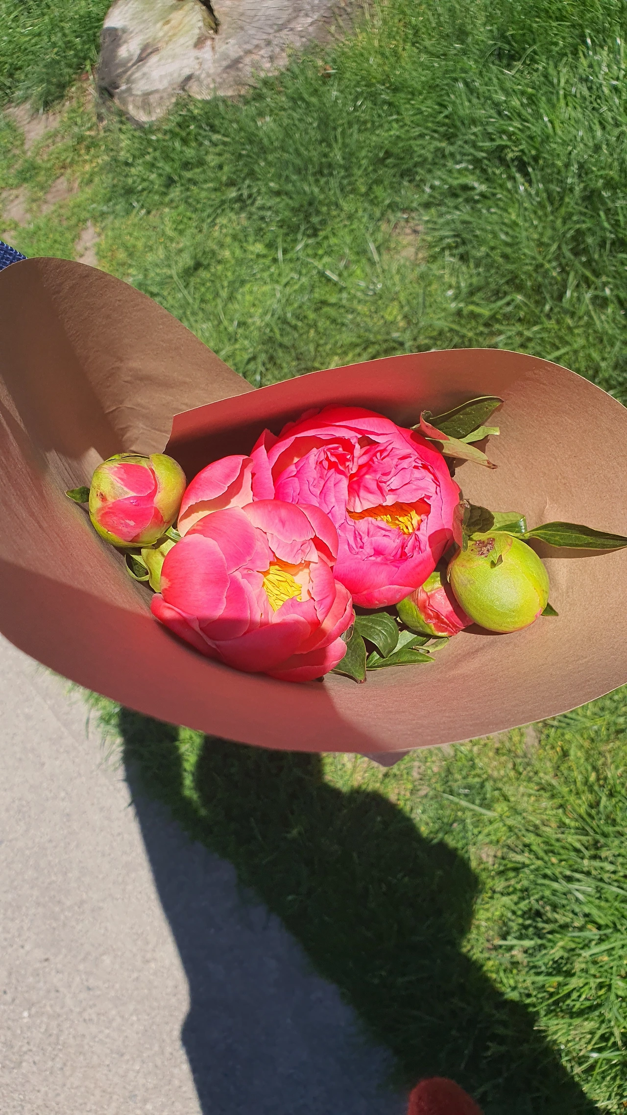 또 어느 일요일에는 파머스 마켓(농산물 직거래 시장)에 갔다. 5월부터 10월까지 밴쿠버의 이곳저곳에서는 주말마다 파머스 마켓이 열린다. 장바구니를 챙겨들고 주말마다 그곳에 가서 신선한 채소와 과일을 사고, 가끔은 빵과 커피를 사먹는 일상을 좋아했는데 간만에 오니 활기차고 명랑한 분위기에 마음이 들떴다. 그런데 사람들이 코랄 작약 꽃다발을 들고 다니는게 아닌가. 그날은 우리의 결혼기념일이었고, 매년 결혼기념일마다 남편은 부케 꽃인 코랄색 작약 꽃다발을 선물해주었다. 코랄 작약은 구하기가 쉽지 않아 매년 단골 꽃집에 미리부터 예약해서 준비했다고 했는데 그 날은 작약 농장에서 코랄색 작약을 잔뜩 가지고 마켓에 왔다. 우리는 이게 무슨 행운이냐며 행복한 기분으로 작약 한 단을 샀다. 동글 동글 예쁘게 피어나는 작약을 안고 마켓을 걸어다니는 내내 웃음이 새어나왔다. 이제 밴쿠버의 파머스 마켓에 올 수 있는 날이 네 번도 안되니까 평소에 궁금하던 모렐 버섯도 사고, 남편이 좋아하는 생면도 사고, 칠리 스프도 사먹었다. 하루에 두 시간 정도 활동하면 지쳐서 내내 쉬어야 하지만, 파머스 마켓에서의 두 시간은 낯선 도시에서 하루 종일 돌아다닌 것처럼 새롭게 즐거웠다.