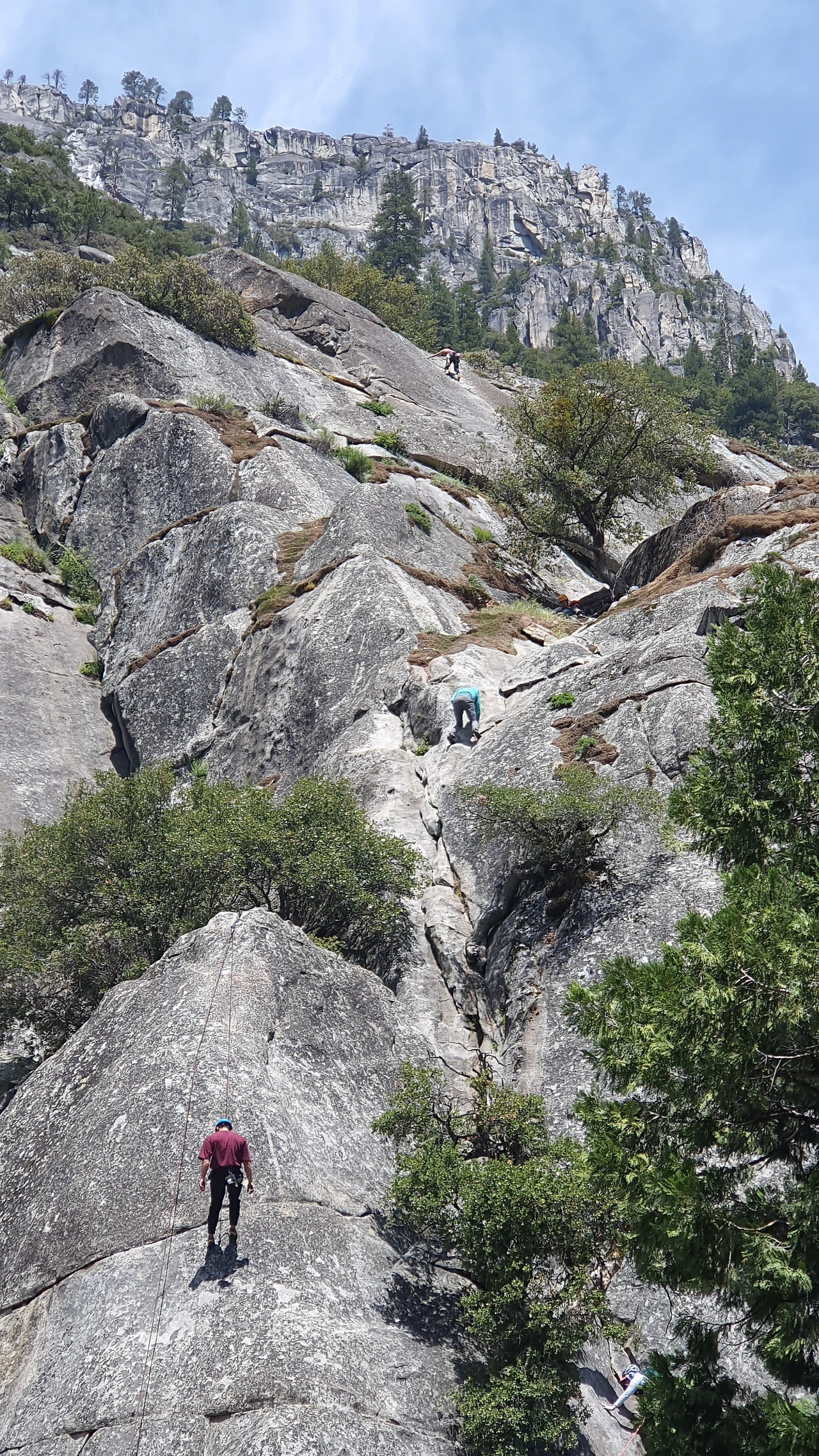 그렇게 하염없이 바위를 오르기 시작하는 사람들을 구경하고 있는데, 남편이 요세미티 폭포도 구경했고, 엘케피탄도 보았고, 터널뷰도 보았으니 혹시 트레일을 오를 생각이 있느냐고 했다. 3~4시간 걸려 요세미티 어퍼 폭포까지 가는 난이도가 높은 트레일에는 첫 번째 뷰포인트인 콜롬비아 락(Columbia rock)까지 가는 왕복 1시간 40분이라 표시된 난이도 초중급의 트레일이 속해 있다고, 그 정도면 할 수 있을 것도 같다고 했다. 나는 잠시 생각했다. 폭염 경보가 내려져 눈이 너무 급히 녹아 모든 길에 물이 넘칠 듯이 찰랑거리는, 뜨거운 요세미티에서 2시간을 걸을 수 있을까? 이미 이곳저곳 구경거리를 보느라고 만 보를 걸었는데. 그런데 불현듯 암벽 등반가들의 생생한 모습이 부러워 보고 있던 나를 깨닫고는, 가보자 했다. 남편은 내가 가지 말자고 할 줄 알았는데 의외라는 듯 등산스틱을 챙겨 왔고 우리는 콜롬비아 락까지 오르기 시작했다.