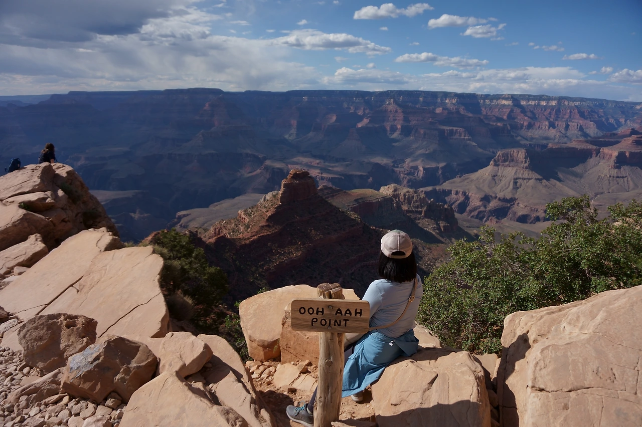얼마간 더 내려가다보니 시야가 탁 트이며 끝 없이 펼쳐진 캐년의 모습이 가까운 듯 먼 듯 펼쳐졌다. 저절로 우와~ 하게 되는 전경이었다. 그리고 귀여운 팻말에 우아 포인트라고 써있었다. 실제로 그렇게 이름이 붙여진 것이었다. 모두가 와 하고 감탄할 수밖에 없는 풍경이었다. 이렇게 아름다운 곳에 사람이 한 명 밖에 없었다. 대부분의 사람들은 그랜드캐년 림 트레일(캐년을 위에서 바라보며 걷는 둘레길)에 머물기에 아래 쪽에서 우리는 이 아름다운 풍경을 마치 우리의 것인 양 고요하고 편안하게 누릴 수 있었다. 종종 도착하는 사람도 바위에 걸터 앉아 조용히 앉아있었고, 우리도 바위에 앉아 시간이 만들어 낸 마법 같은 풍경을 오래 오래 누렸다.