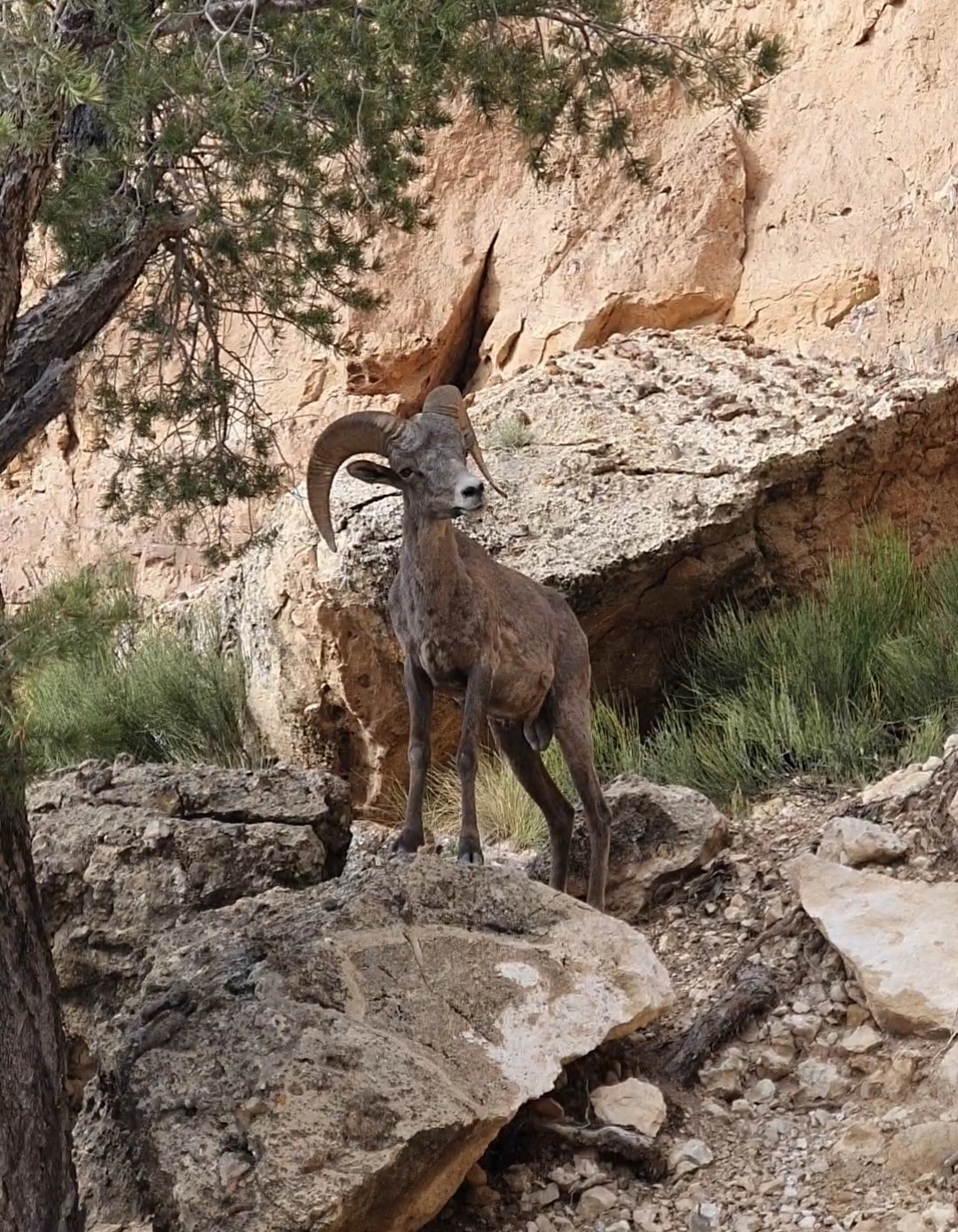 그리고는 다시 걸어 올라왔다. 여기까지 내려온 사람들은 대부분 우아 포인트에서 잠시 머물고 더 내려가던데 우리는 그럴 수 없는 몸을 가졌기에 더 내려갈 수 없었다. 그렇게 올라오는데 덥고 발걸음이 무거웠다. 내려오는 방향에서는 계속해서 아름다운 그랜드 캐년의 모습이 눈앞에 펼쳐졌는데, 뒤를 돌아 올라가는 길에는 그 모습도 보이지 않고 연갈색의 땅과 메마른 흙이 주로 보이기에 정신적인 고양됨이 가라 앉아 지쳤다. 트레일의 좋은 점을 깨달았다고 한들 여행 열흘만에 근육과 체력마저 다른 사람처럼 바뀔 수는 없는 것. 등산 스틱에 매달려 가다시피 힘겹게 한걸음 한걸음을 옮겼다. 작은 나무라도 있어 그늘이 있으면 멈춰서 앉아 쉬며 느릿 느릿 돌아가다보니 이제 그만 걷고 싶었다. 그렇지만 아무것도 없는 트레일에 내 다리가 아니면 나는 돌아갈 수가 없다. '우와 우와' 하며 내려올 때와는 달리 '아이고 아이고' 하며 오르고 있는데 갑자기 길 옆 깎아지른 곳에서 큰뿔양(빅혼쉽)이 걸어올라왔다. 이 무슨, 사파리도 아니고. 사람들이 다니는 길에 올라선 큰뿔양은 유유히 내 앞을 지나쳐 왼 쪽으로 조금 올라가더니 멈춰서 의기양양하게 서 있는 것이 아닌가. 마치 '인간들이여 나를 보고 감탄하라-' 하는 듯한 포즈로 가만히 서 있었다. 내려오던 사람들도 올라가던 사람들도 이 동물을 발견하고는 다들 내적 감탄하며, 오 마이 갓!을 입모양으로 외치며 발걸음을 멈추고 기쁨의 미소를 지었다.