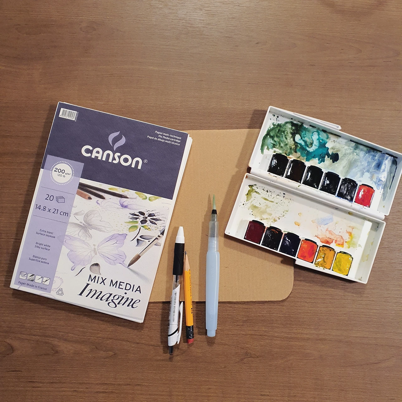 설레는 마음으로 서랍 한켠에 있던 종이와 연필, 물붓과 팔레트를 챙겼다. 스케치북이 아니라 낱개로 들어있는 수채화 종이를 쓰는데 종이를 고정하는 클립 보드가 없어서 옷을 담아 두었던 신발 상자를 잘라 종이 뒤에 대어 고정하는 보드를 만들었다. 좁은 집에 살면서 물건을 사는데 더 고심하게 되었기에 밖에서 계속 그림을 그릴지 알 수 없어 일단 재활용을 했다.