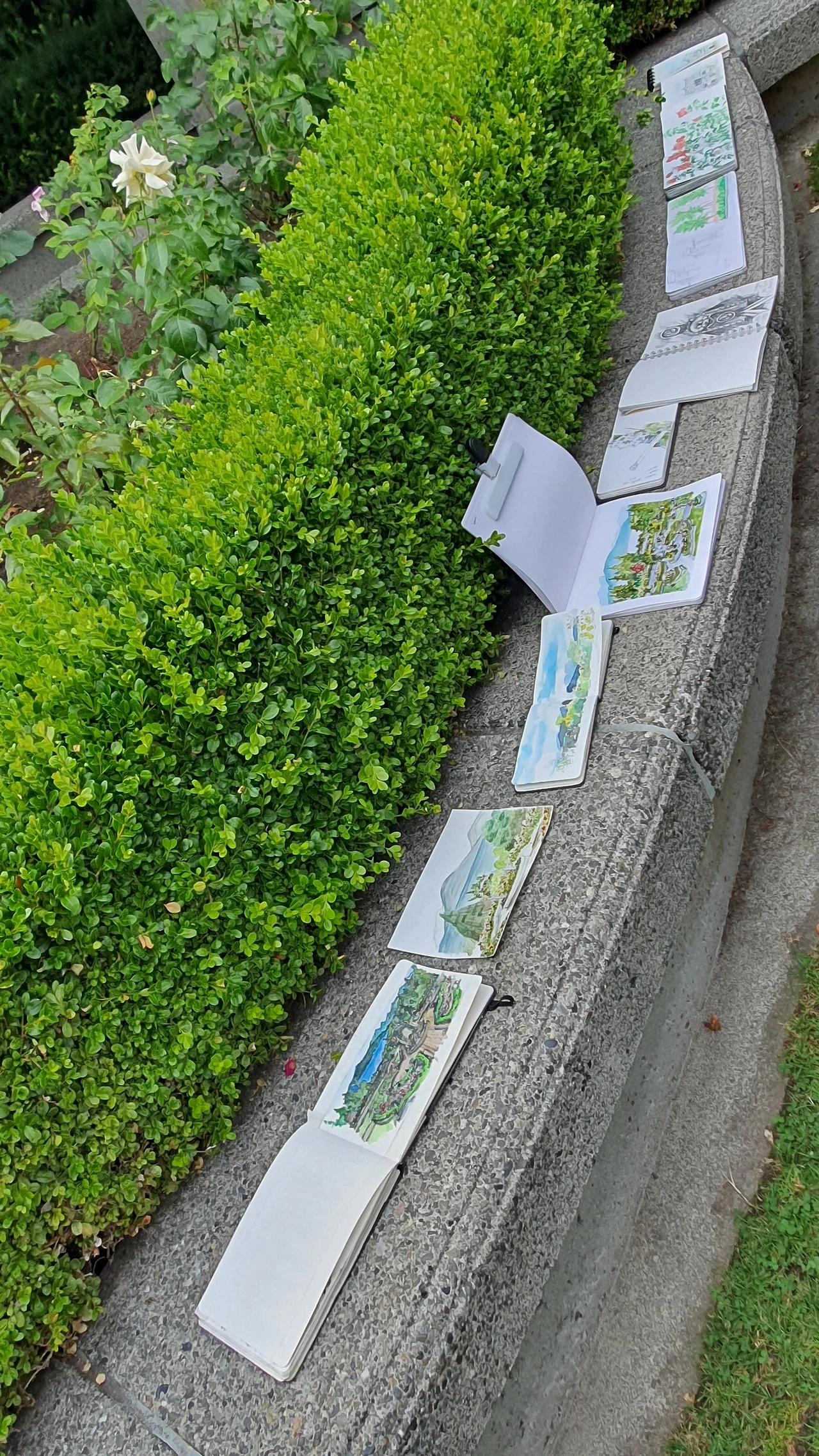 나름 외향적인 나는 어떤 새로운 모임에 나왔을 때 이렇게 서로에 대해 묻지 않는 것이 신기했다. 그들은 다들 흩어져 로즈 가든을 걸으며 그리고 싶은 풍경을 골랐다. 어떤 사람은 장미 넝쿨 바로 앞에 앉았고, 어떤 사람들은 계단 위 높은 곳에 앉아 넓은 전망을 가늠해 보았다. 나는 그들을 구경하다가 평소에 자주 산책 나와 바라보던, 내가 감탄해 온 전망을 손으로 옮기기 좋은 자리를 찾아 앉았다. 그리고 스케치를 하기 시작했다.