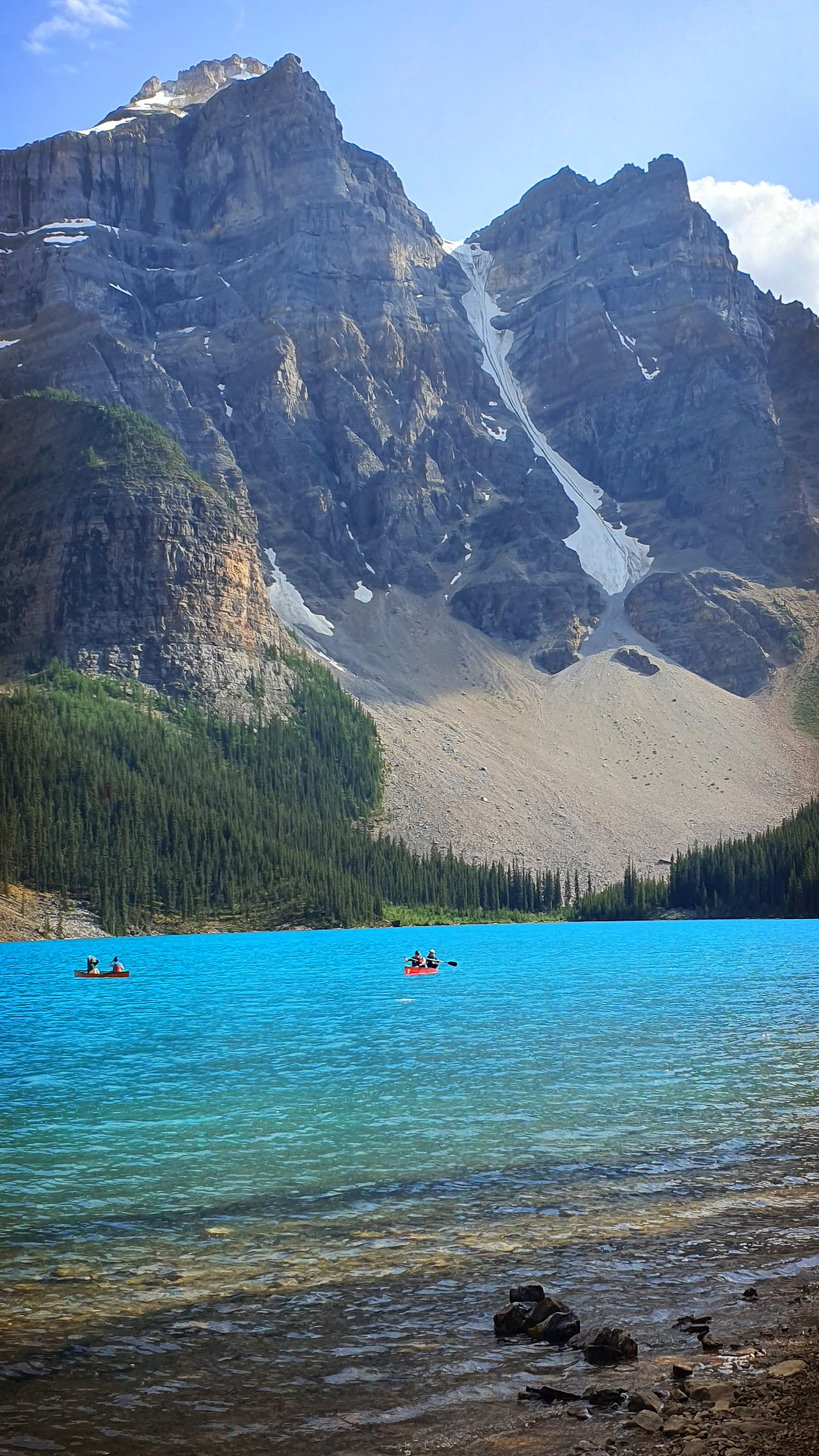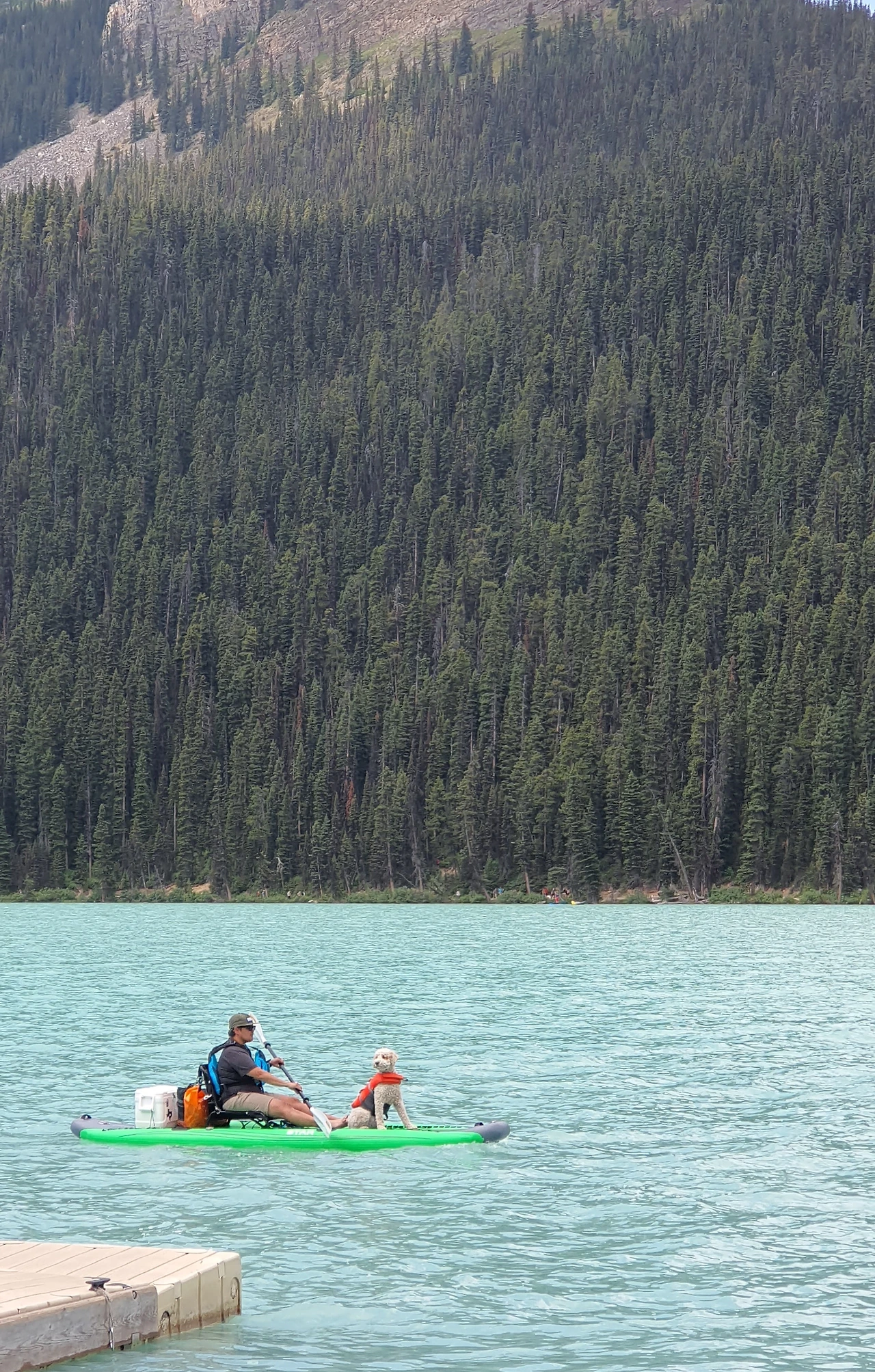 원래 사람들과 북적이며 어울리지 않는 둘째가 조용히 이 곳을 누렸으면 해서 둘째랑 막내를 한 배에 태우고 나랑 남편이 엄마를 가운데에 태웠다. 현실에 있기엔 너무도 아름다워 그림 같다는 말 외에는 표현할 길이 없는 레이크루이스에 우리가 탄 붉은 배가 미끄러져갔다. 김준서의 피아노 연주곡을 틀고 남편과 나는 노를 저었다. 귀여운 엄마는 "너무 행복해서 울컥해~" 하더니 또 우셨다. 엄마 또 우냐며 놀리며 호수 가운데로 갔는데 구름 뒤에 가렸던 해가 나와 호수에 반짝이는 빛망울을 뿌렸다. 빛망울을 한참 바라보다 고개를 드니 저 멀리 둘째랑 막내가 노도 젓지 않고 말 없이 앉아 있었다. 풍경에 녹아든 모습이었다. 언제나 감탄하거나 말을 하느라 시끄러운 엄마도 조용했다. 갑자기 왈칵 눈물이 났다. 그러니까, 이 순간이면 충분해서. 각자 바쁘게 사는 와중에 함께 여행할 마음을 먹고, 함께 여행할 수 있는 여건이 된다는게 얼마나 드문 일일지, 앞으로의 삶에서도 이 순간이 내게 얼마나 힘이 될지 한 순간 느껴졌다.