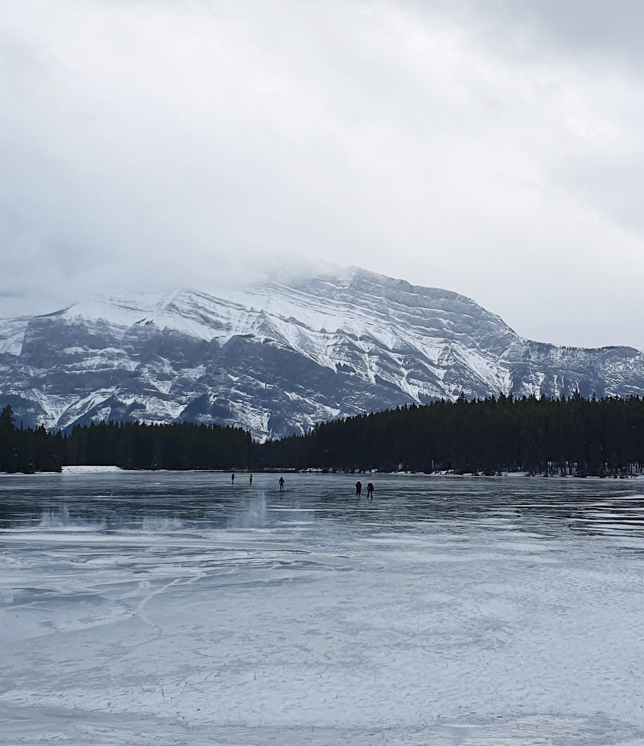 다시 이동하면서 우리는 행복감에 젖어 말이 없었다. 그런데 금방 작은 공터가 나왔다. 차들이 꽤 있길래 여긴 뭘까 하고 내렸는데 사람들이 스케이트를 들고 내려가고 있었다. 조금 걸어 내려가니 또 한번 탄성이 나왔다. 포근한 날인데도 호수는 얼어있었고 사람들은 너무 즐겁다는 얼굴로 해사하게 웃으며 스케이트를 타고 있었다. 그 뒤로 펼쳐진 거대하게 조각 된 산. 함께 여행 온 것 같은 할머니 할아버지 여섯 분은 호숫가에 앉아 스케이트를 신고 계셨다. 나랑 남편은 초등학생 때나 스케이트를 타봐서 지금 타면 넘어져서 다칠 것 같다, 걷지도 못할 것 같다며 부러움 섞인 소소한 걱정을 나누고 있는데 할머니 할아버지들이 일어서서 나아가기 시작하셨다. 그 분들은 스케이트를 정말, 못타셨다. 초보인데 빌린 스케이트를 들고 이 곳에 와서 저렇게 아이 같이 신나는 표정을 짓고 계신 거였다.
