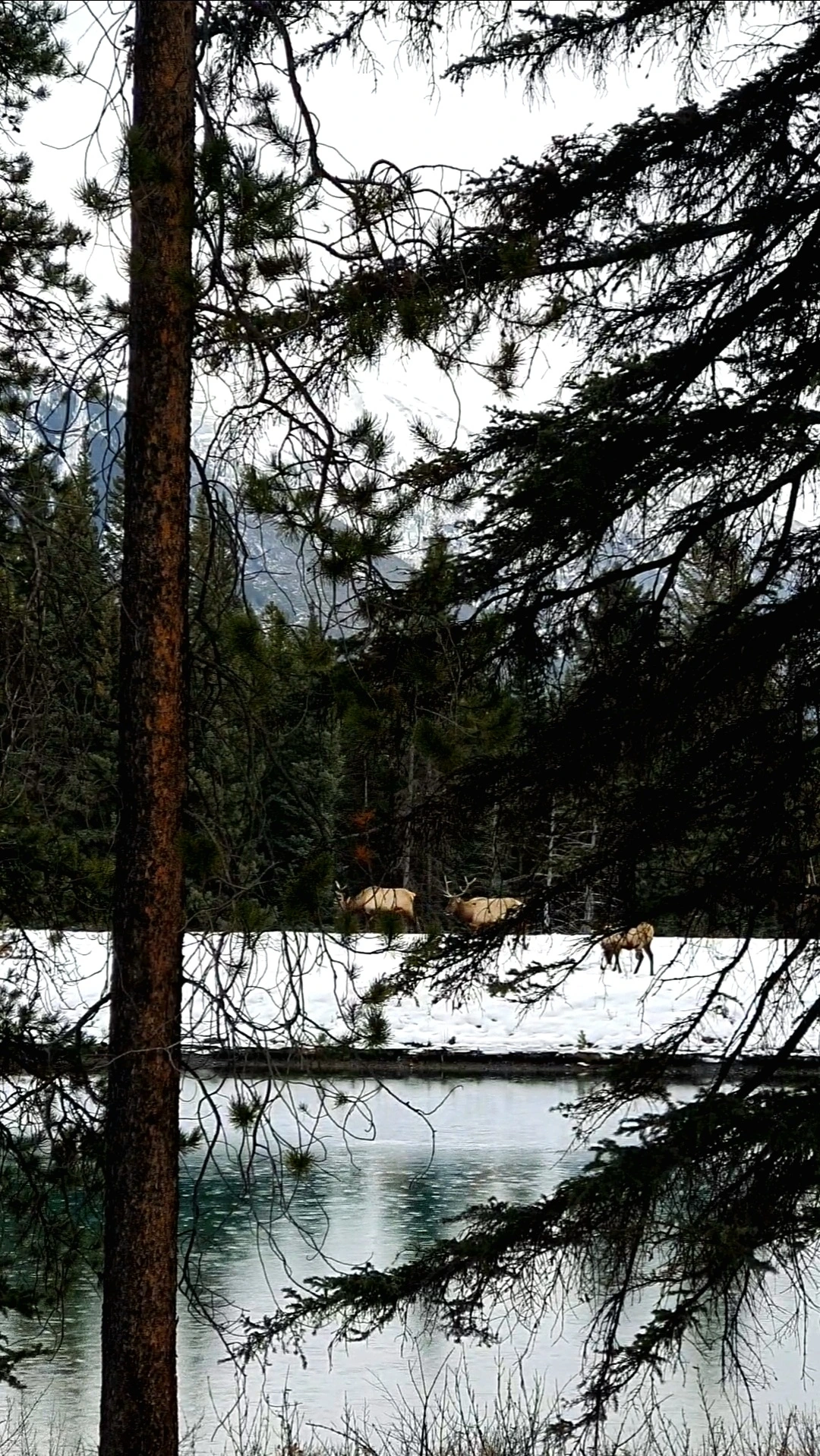 추천해주신대로 보우 폭포에 가는 길 높은 곳에서 보이는 설경도 보고, 여름과 달리 얼어 붙은 낮은 폭포도 봤다. 꽤 유명한 곳인데 사람이 한 명도 없었다. 겨울만의 매력에는 고요함이 더해진다. 바나나를 간식으로 먹고는 미네완카 호수로 향했다. 미네완카 호수로 가는 드라이브 길이 풍경이 아름다운 길이라고 했다. 가는 길 투잭 호수도 거쳐 가라고 했다. 구불구불한 산 길, 양 옆에는 눈 덮인 산이 조각같이 펼쳐져 있었다. 감탄하며 가는데 도로 한가운데에 차가 멈춰서 있었다. 뭐지? 뭐가 지나가나? 하며 우리도 차를 멈춰 오른쪽을 보니 아직 얼지 않은 강의 빛깔이 청아했다. 그리고 펼쳐진, 나무 사이로 커다랗고 아름다운 뿔을 가진 다섯마리의 엘크가 유유히 걸으며 풀을 먹고 있는 모습.