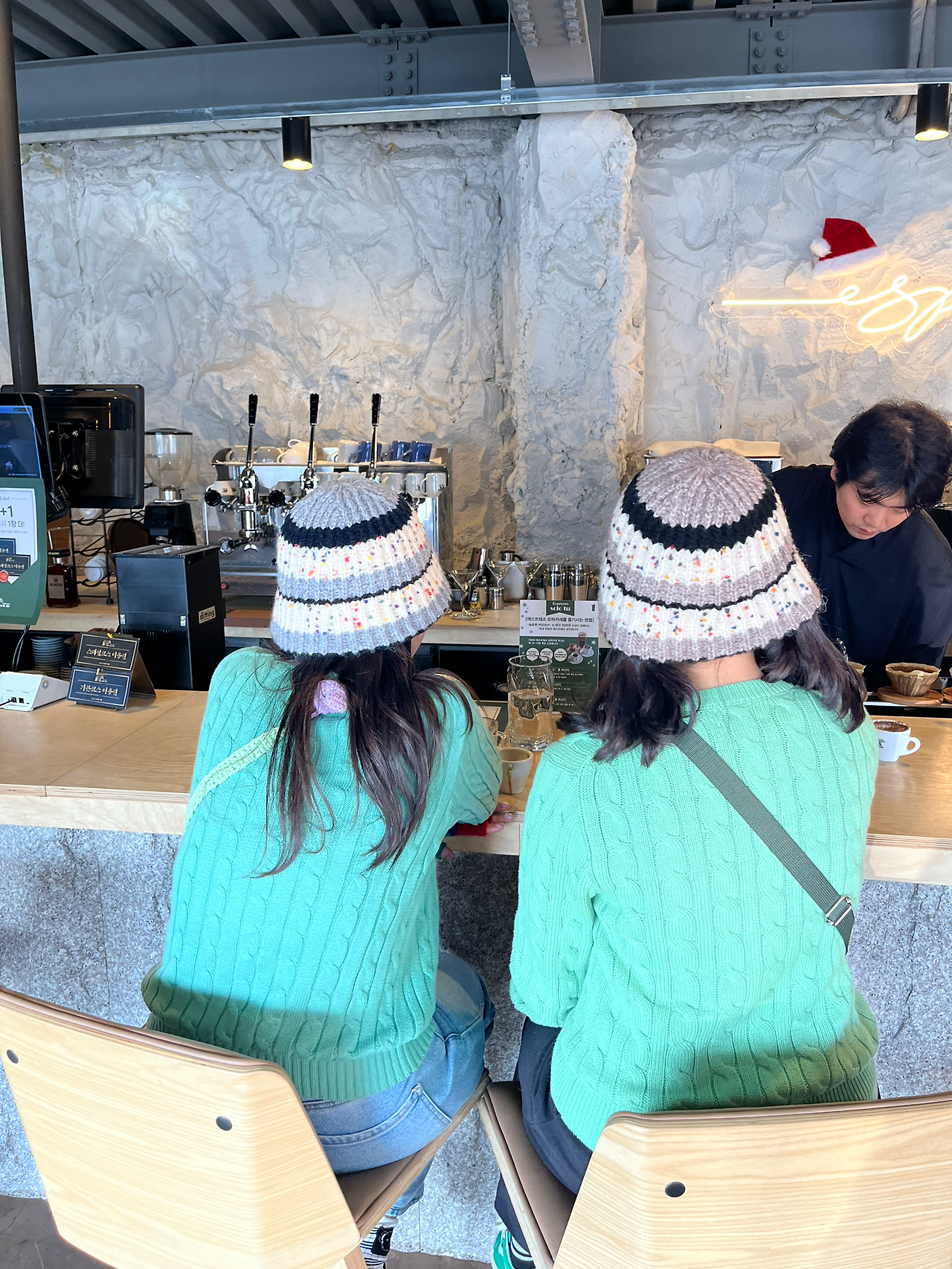 비슷한 색의 같은 브랜드 니트가 있어 모자와 니트 클로닝하고 남편이랑 셋이 카페에 간 날이다.