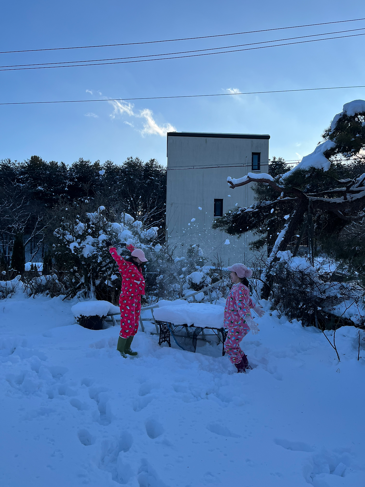 기회가 생겨서 둘이 앞마당에서 같은 잠옷을 입고 눈을 신나게 즐긴 날이다.