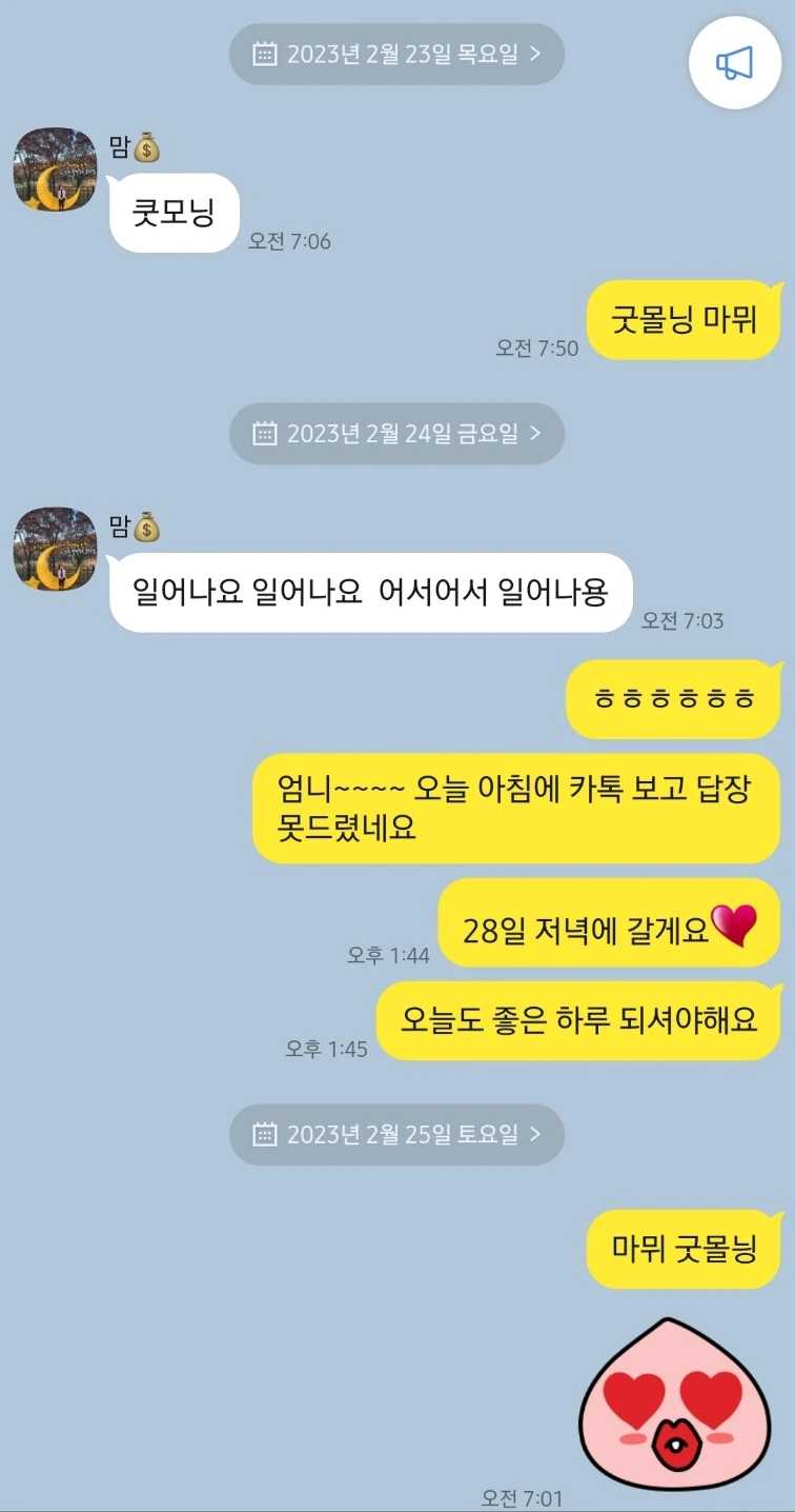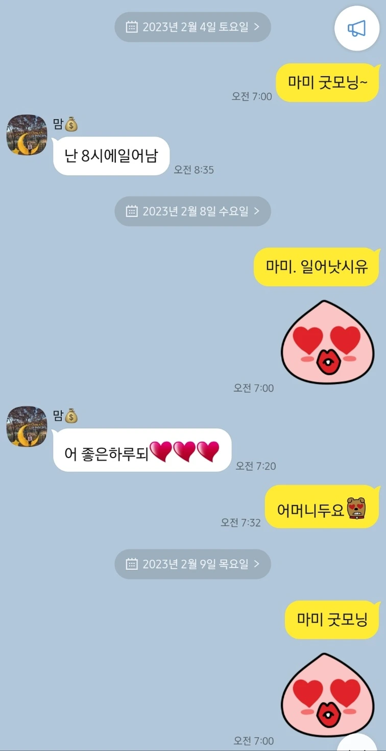 나의 선톡에 엄마는 전화 대신 카톡으로 모닝콜을 대신했고 어떤 날은 엄마가 먼저 선톡을 하기도 했다.