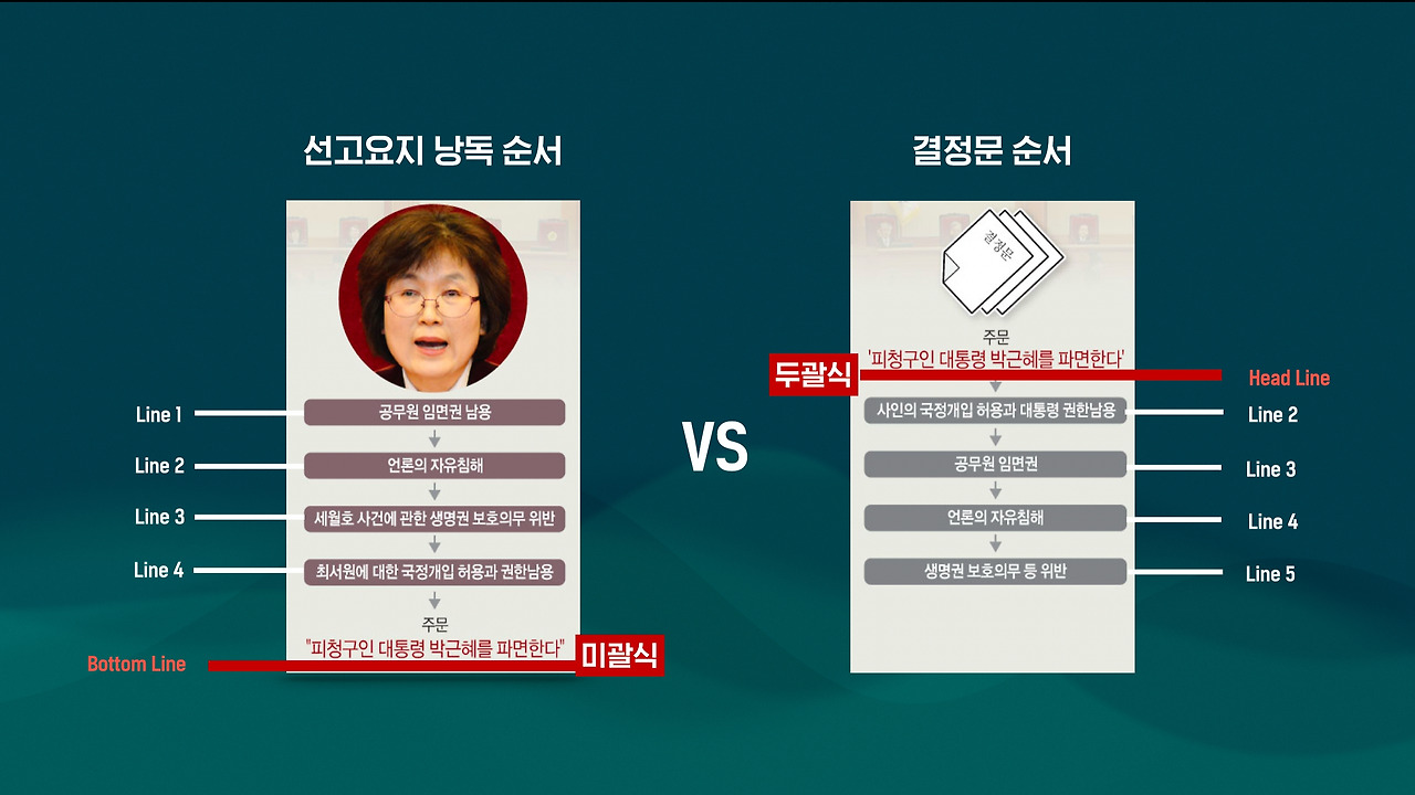 2017년 탄핵선고 낭독문과 결정문의 사유 순서와 배치의 공통점도 있다. 결론에 바로 붙어있는 사유는 둘다 ’사인(최순실)의 국정개입 허용과 대통령 권한남용‘이었다. 의도적이었다. 모두 결론의 임팩트를 극대화하기 위해서였다. 설득력을 높이기 위해서였다.