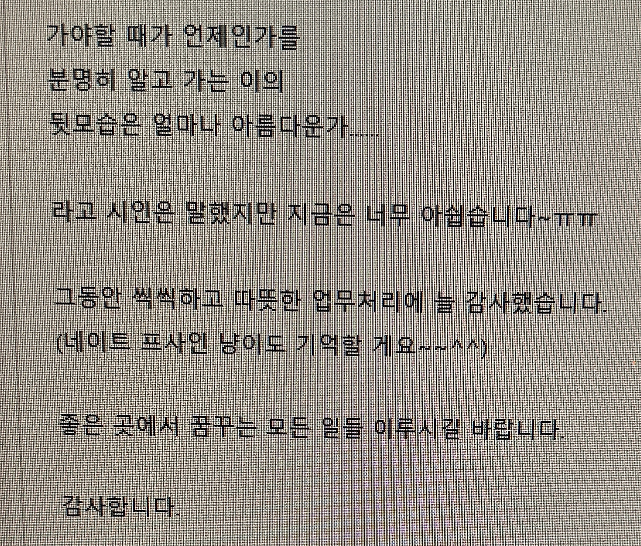 그런 생각을 하면서 거래처 및 동료들에게 퇴사 소식을 전하니 내가 업무상 어떤 사람이었는지가 명확해져갔다. 나에 대해 좋게 말씀해주시는 분들 조언해주시는 분들, 모두 너무 감사한 마음이고 내가 그래도 인복이 없지는 않았구나 느끼게 되는 시간이었다.