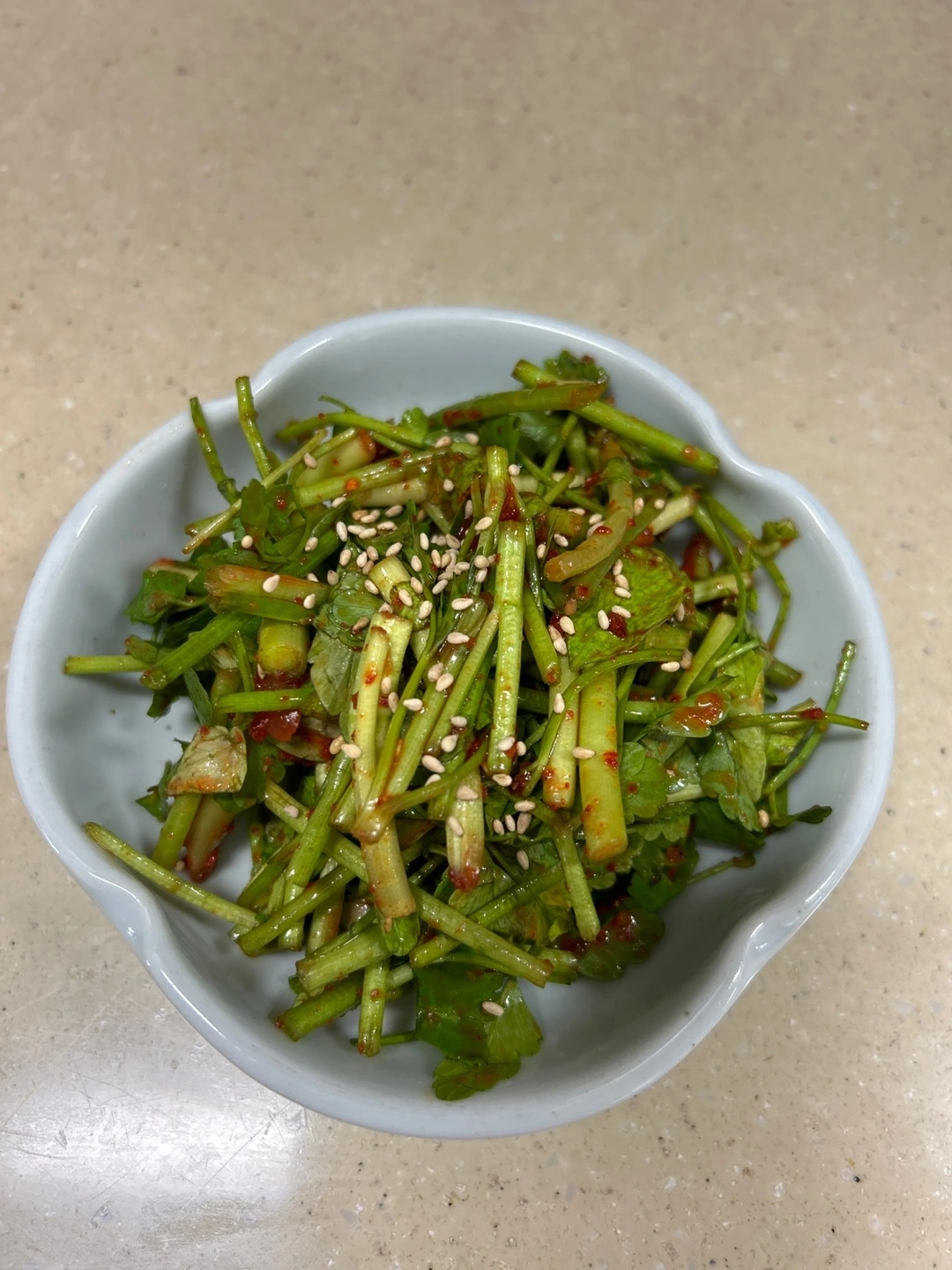더하자면, 나는 당근을 많이 먹어야 해서 당근도 채 썰어 넣는데 의외로 궁합이 좋다. 당근을 넣을 때는 당근에 양념옷을 입힌 후 미나리와 손잡게 해 주면 된다.