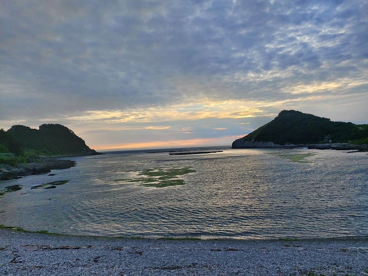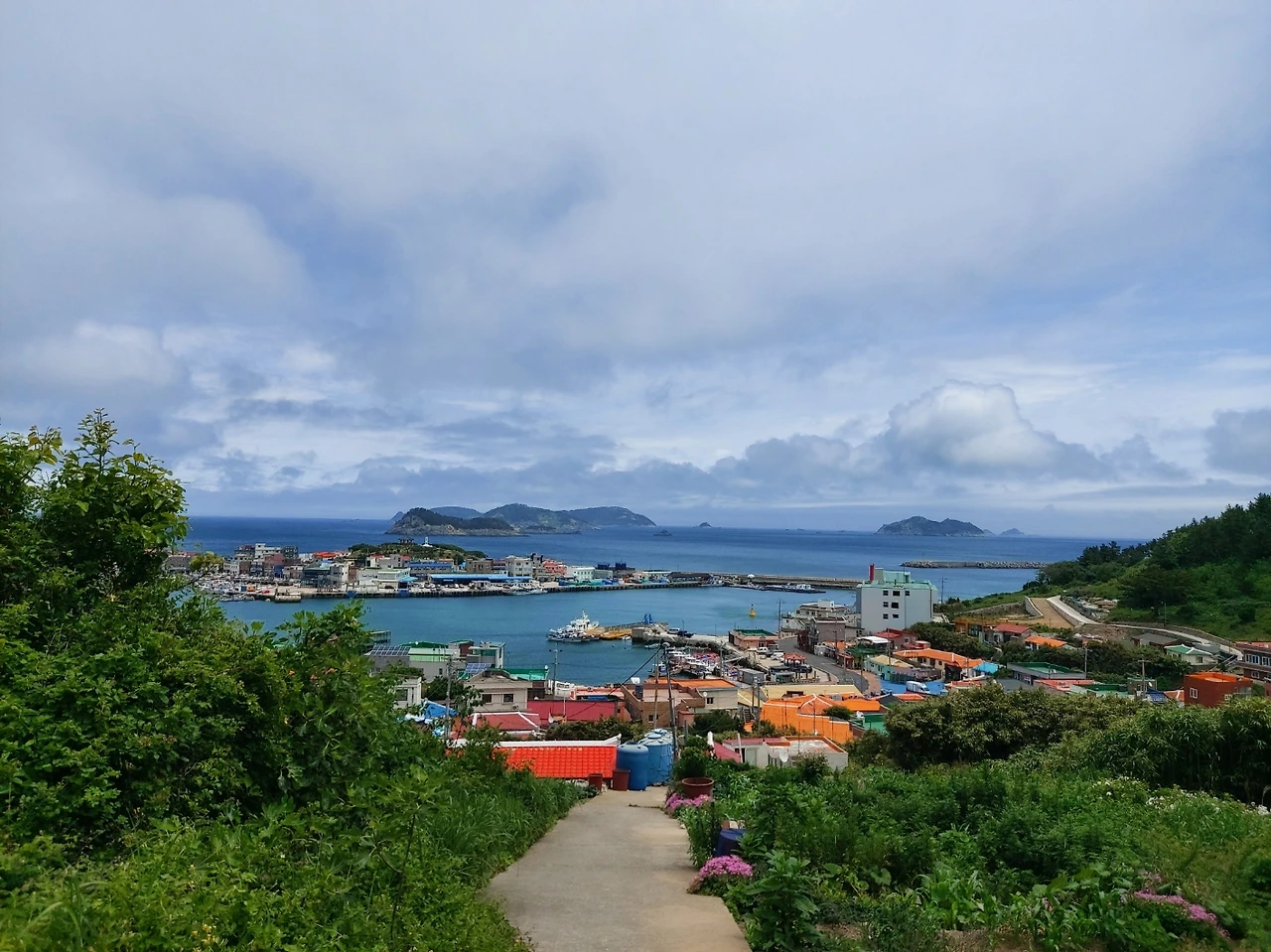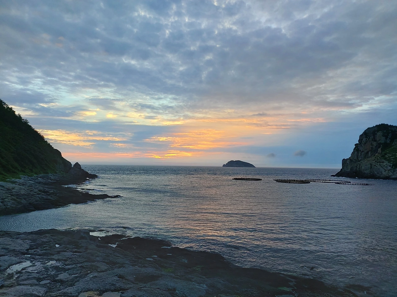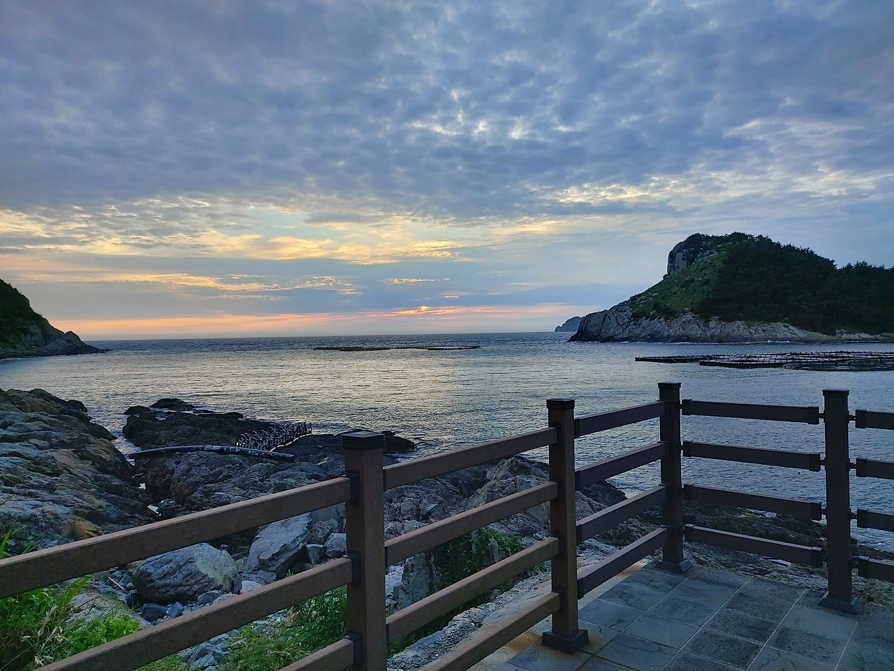 기가 막힌 저녁을 먹었다. 며칠 되지 않은 호텔뷔페가 식상하게 느껴졌는데 석쇠에 구워 슴슴하고 탱글한 굴비와(조기였나? 이런, 나 주부가 맞나?) 갈치속젓, 파김치, 총각무김치, 김치... 무엇보다 엉겅퀴가 시래깃국의 모습으로 나왔는데 맛이 기가 막혔다. 몸에 좋은 엉겅퀴를 된장과 버무려 국으로 끓여낸 국을 일행 모두 감탄하며 먹었다. 심지어 밥을 두 그릇씩 먹는 이들도 있었다. 저녁을 먹고 무거워진 몸과, 가벼운 복장으로 야간 트레킹을 갔다. 트레킹이란 말에 흠칫했으나 낙조를 보기 위한 힐링타임이었다. 흐린 날씨 탓에 큰 기대하지 않았음에도 섬에서 보는 낙조는 장관이었다. 비가 예고된 내일이 더 기대되는 이유였다.