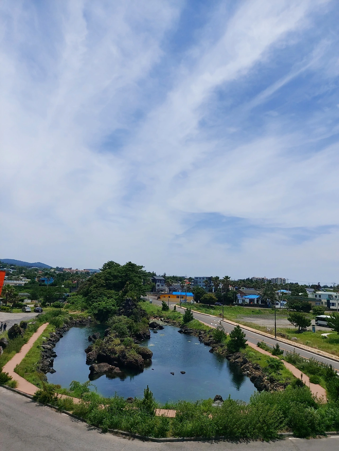 마을길을 따라가다가 멋지게 놓인 다리(작가 가칭 위미교)를 건너보았다. 시원하게 부는 바람도 좋았지만 다리의 중심부쯤에서 바라보는 마을경치와 한라산과 산 위에 펼쳐진 구름(일행의 말을 빌리자면, 솜사탕 같은)은 입을 다물 수 없게 했다.