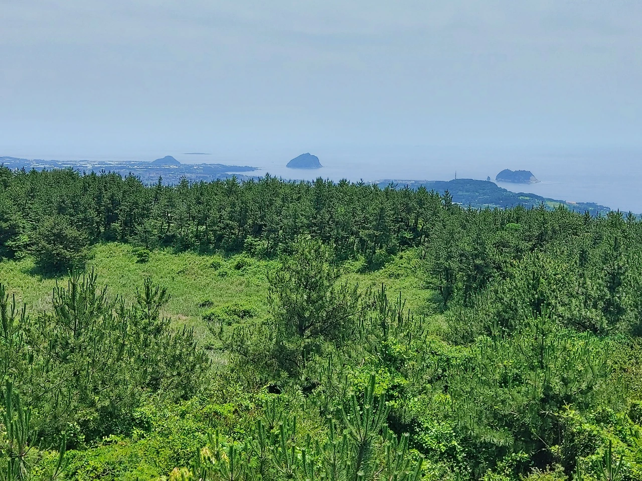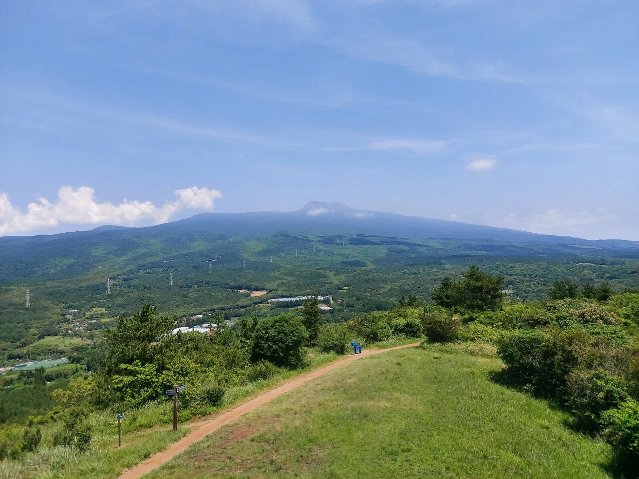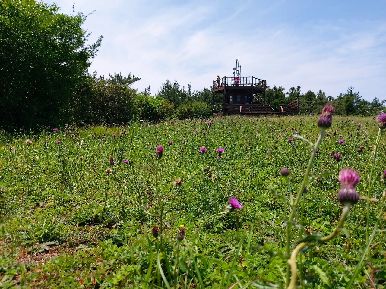 전망대로 오르는 계단은 가파르고 길었다. 하지만 빼곡히 서 있는 나무그늘 덕에 크게 힘든 줄 모르고 산을 올랐고 중간스탬프를 찍으며 바라본 한라산은 그리 멀지 않아 보였다. 엉겅퀴 군락을 정신없이 쳐다보고 있으려니, 먼저 올라온 일행이 슬쩍 귀띔해 주었다.
