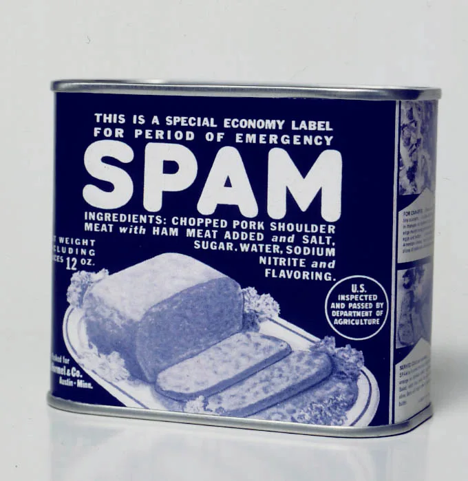 스팸(SPAM)은 1937년 미국 식품회사 호멜(Hormel Foods)에서 개발된 통조림 햄입니다. 돼지고기 어깨살과 햄, 소금, 물, 감자 전분, 설탕, 질산나트륨 등을 혼합해 만든 이 식품은, 냉장 보관 없이도 장기 저장이 가능하고 조리가 간편하다는 특성 덕분에 대량 소비 시대에 적합한 단백질 공급원으로 주목받았습니다.