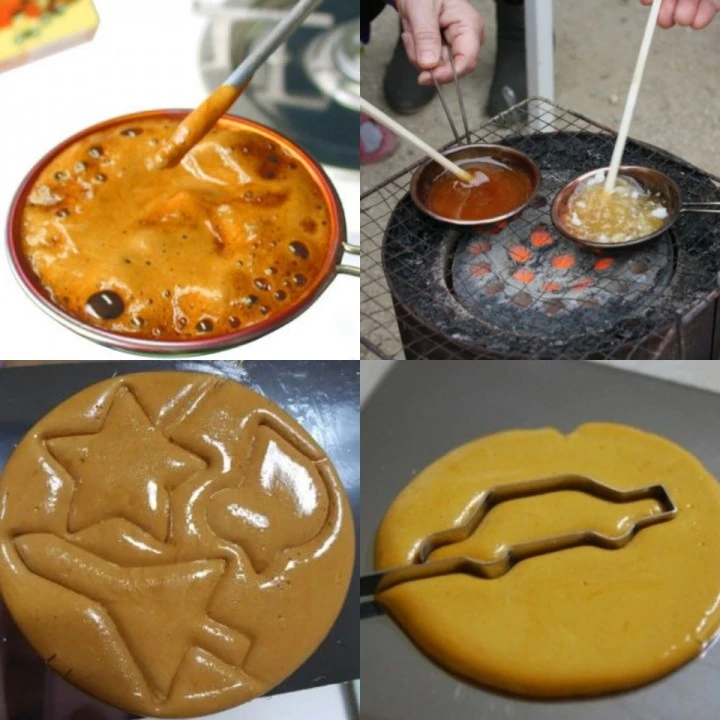 대개 뽑기 하시는 분들이 다양한 형태의 황금빛 사탕도 같이 취급하셨는데 뽑기의 모양을 잘 뜯어내서 완성한 아이들이 상품으로 그 사탕을 타가기도 했어요. 아무튼 뽑기 장사하시는 분들이 뽑기와 함께 판매하시던 고급 버전의 상품이 있었는데 그게' 달고나'에요.