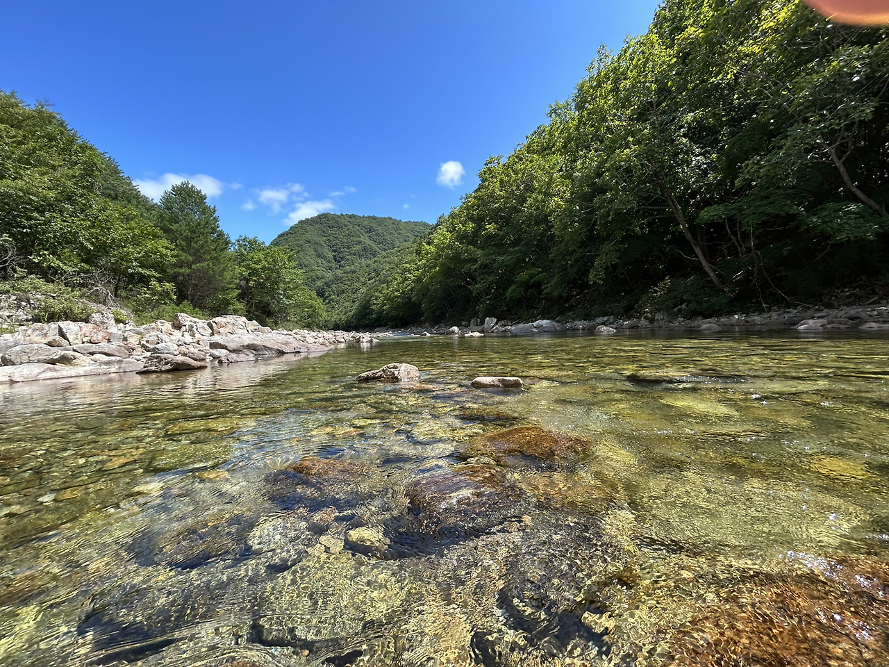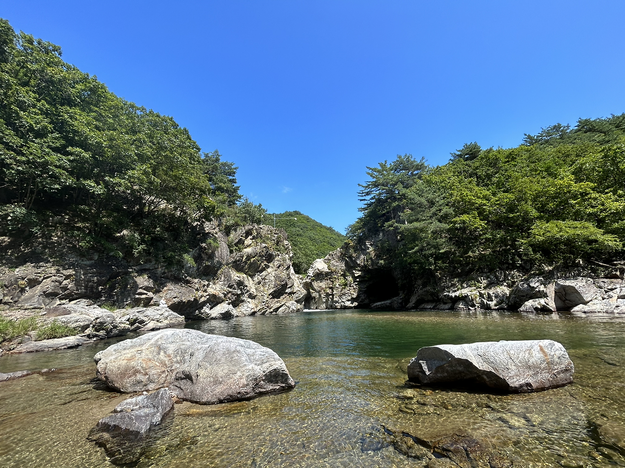 두타연 계곡물은 참으로 맑고 투명했다. 다녀본 계룡산 숫용추 계곡물, 백담사 계곡물의 깨끗함을 뛰어넘었다. 인적이 드문 자연이 만들어내는 보물임이 분명하다. 사실 올여름 두타연 계곡여행을 계획할 때는 계곡에 발을 담그는 정도의 짧아도 좋을 물놀이를 상상했다. 하지만 아니었다. 징검다리를 건널 때 아주 잠깐 발을 담그고 손을 씻을 기회는 있었지만 그저 보는 것이 다였다. 그것도 좋았다. 보기 드문 깨끗한 물을 볼 수 있었고, 치열한 전쟁을 치른 이 땅이 그냥 지켜진 것이 아니라는 뼈아픈 사실을 다시금 깨닫게 해 준 여행이었기 때문이다.