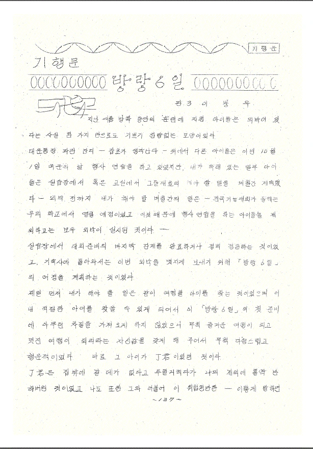 지난여름방학 동안의 훈련에 지친 아이들은 외박이 있다는 사실만으로 기쁘기 한량없는 모양이었다. 대운동장 파란 잔디(잡초가 생각난다) 위에서 다른 아이들은 이번 10월 1일 국군의 날 행사연습을 하고 있었지만 내가 속해 있는 일부 아이들은 실습장에서, 혹은 교실에서 그들대로 해야 할 일을 며칠간 계속했다. 외박 전까지 내가 해야 할 며칠간의 일은 (전국기능대회가 올해는 우리 학교에서 열릴 예정이었고 이것 때문에 행사연습을 하는 아이들을 제외하고는 모두 외박이 실시된 것이다.) 실습장에서 대회준비의 마지막 단계를 완료하거나 정리정돈을 하는 것이었고, 기숙사에서 돌아와서는 이번 외박을 멋지게 보내기 위해 ‘방랑 6일’의 여정을 계획하는 것이었다.