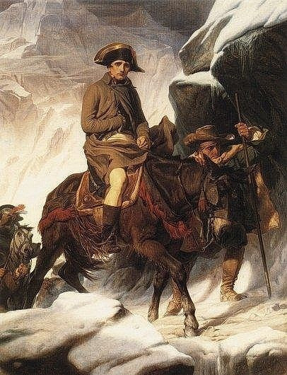 그 후 나폴레옹을 추앙하는 이미지와 이야기는 그를 더욱 불세출의 영웅으로 만들었다. 그중 ‘생 베르나르 고개의 나폴레옹(Napoleon at the Saint-Bernard Pass, 프랑스어: Le Premier Consul franchissant les Alpes au col du Grand Saint-Bernard)’은 프랑스 화가 자크 루이 다비드가 1801년부터 1805년 사이에 그린 나폴레옹 보나파르트의 승마 초상화 5점 시리즈이다. 알프스를 건너는 나폴레옹(Napoleon Crossing the Alps) 또는 알프스를 건너는 보나파르트(Bonaparte Crossing the Alps)라고도 불린다. 이 작품은 나폴레옹과 그의 군대가 1800년 5월 그랑 생베르나르 고개를 통과해 알프스 산맥을 넘어간 실제 횡단에 대한 매우 이상적인 시각과 이미지를 보여준다. 반면에 프랑스 예술가 폴 들라로슈가 그린 1850년 유화는 나폴레옹이 초라한 군복을 입고 노새를 타고 알프스를 통과하는 모습을 그리고 있다. 나폴레옹 사후 19년이 지난 때 제작된 것이다. 다비드 그림의 영웅적 모습은 온데간데없다. 권력을 벗어난 이미지의 반란인가?