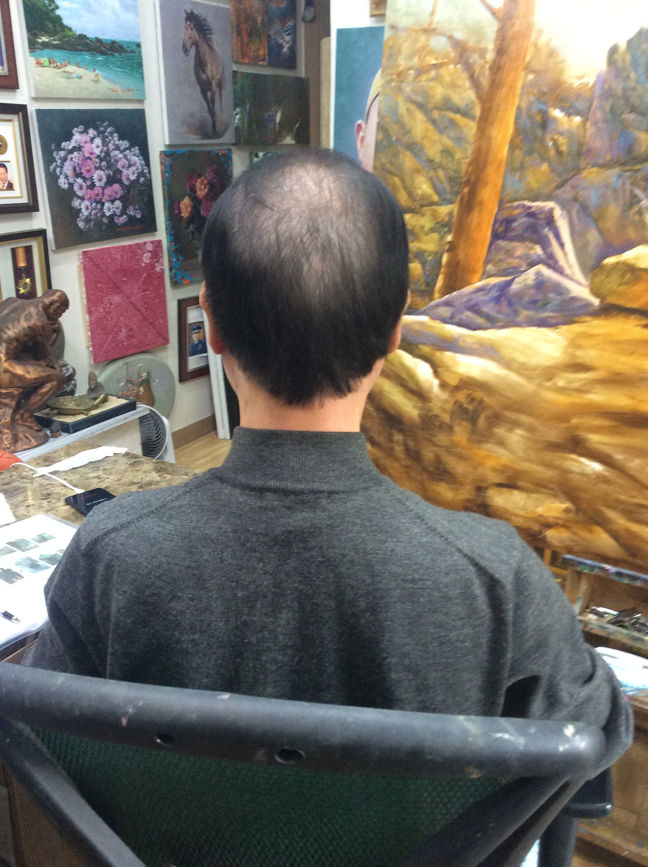 위 사진은 어느 70대 화가 P의 뒷모습이다. 그의 약간 듬성듬성한 검은 머리가 제일 먼저 눈에 띈다. 이어 등, 두드러진 의자 등받이, 앞에 놓인 그림들이 보인다. 처음 볼 때는 인물의 뒷머리가 인상 깊게 들어오지만 화면이 익숙해지면서 점점 인물의 뒷모습은 전체 화면의 한 부분이 되어 객체화되기 시작한다. 화가 P는 이야기의 주인공이 아니라 오히려 화가를 보는 사람이 자기의 지난날의 경험과 지식, 자신이 처한 상황에 덧붙여 이야기를 만들어낸다. 무속인의 형형한 눈빛과 대조적이다. 뒷모습은 보는 자의 내러티브(Narrative) 영역인 것이다.