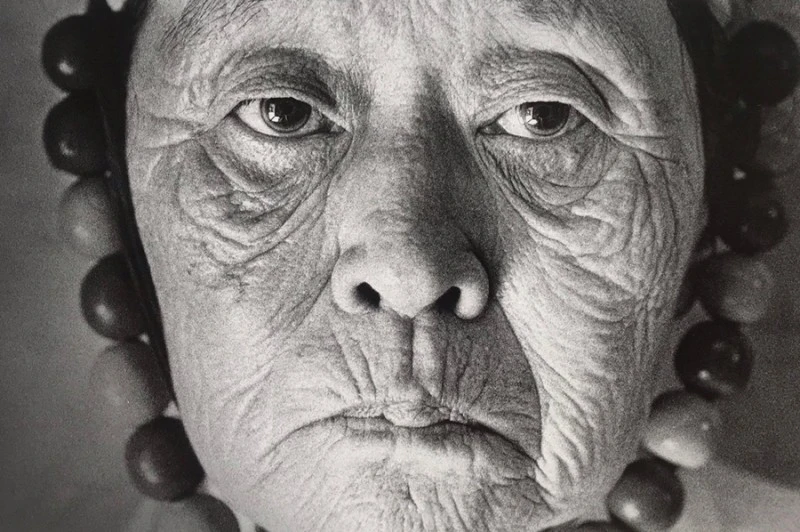 앞모습에서 가장 인상적인 것은 강렬한 눈, 시선이다. 특히, 쏘아보는 듯한 눈, 형형한 눈이 더욱 그렇다. 아래 사진은 사진가 육명심이 강원도 강릉에서 1983년도 찍은 무속인의 얼굴이다. 이 사진에서 가장 먼저 눈에 띄는 것은 형형한 눈이다. 눈동자에 비친 물체가 보일 정도로 선명하게 빛나는 눈. 이어서 사람마다 순서의 차이는 있겠지만 코와 콧구멍, 깊이 파인 주름살, 웃음기 없는 표정, 무속인들이 머리에 쓰는 모자에 달린 둥근 구슬알들이 차례로 눈에 들어온다. 이 사진을 찍은 때가 지금으로부터 40년 전이라는 사실과 사진으로 가늠되는 그녀의 당시 나이로 추정해 볼 때 그녀는 더 이상 이 세상 사람이 아닐 가능성이 높다. 그녀의 실재는 부재하지만 그녀는 유령이 아니라 강렬한 눈빛과 표정으로 엄연히 현실에 존재하고 있다. 그녀가 말하려는 것이 무엇인지, 무슨 생각으로 저런 표정을 짓고 있는지 알 수 없다. 하지만 그녀가 무속인이라는 사실로부터 그녀가 우리의 속마음을 꿰뚫어 보고 있다는 느낌과 영적인 묘한 감정을 유발해 섬찟하다는 기분마저 들게 한다. 이 모든 것은 그녀의 앞모습에서 발화되고 있다. 형형한 눈을 가진 무속인의 앞모습이 던지는 주장이다.