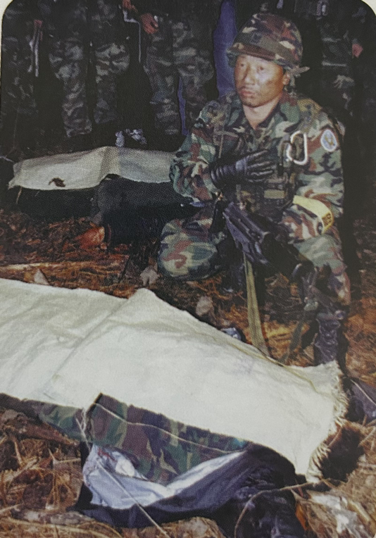 사실 조금 전까지만 해도 우린 슬픔과 분노, 허기에 차 있었다. 저 검은 주검들이 쏜 총탄에 아군 대령(후에 장군으로 추서 진급) 한 분과 여러 장병, 군견이 목숨을 잃거나 부상을 당했다. 게다가 대령과 군견이 쓰러진 현장에는 검붉은 피가 흥건히 고여 있었는데 우린 그 옆자리에 아무렇게나 앉아 마을에서 긴급 조달한 식은 밥을 라면국물에 말아 허기를 채워야 했다.