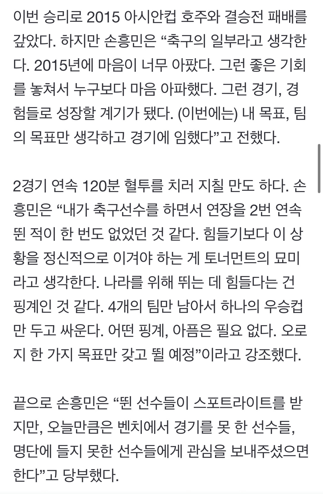 1:0으로 지고 있는 상황에서 추가시간이 1분 남짓 남은 순간 주장 손흥민이 몸을 날려 PK 기회를 얻어냈다. 이번 대회 거의 매 경기 선발로 풀타임을 뛰고(정확하지 않음) 직전 경기에 120분 이상을 뛰고선