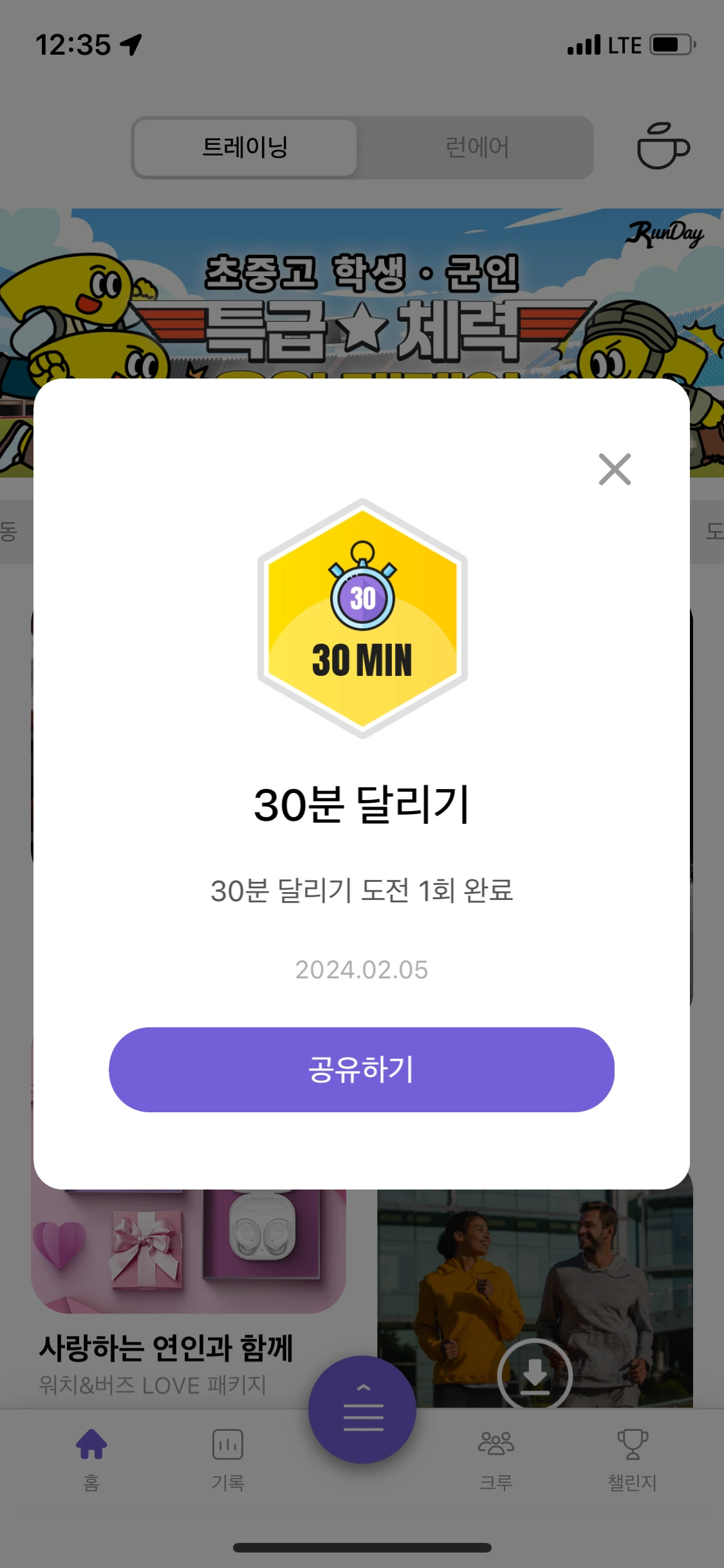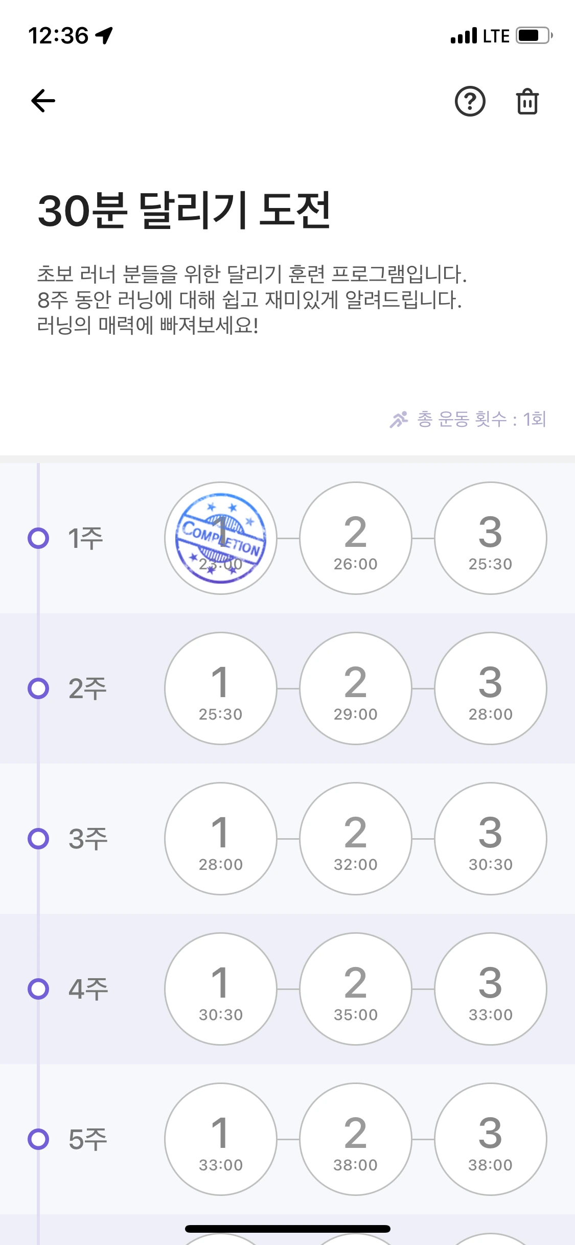이번에 런데이로 하는 도전은 30분 달리기-초급인데 일주일에 세 번씩 8주 플랜으로 되어있다.