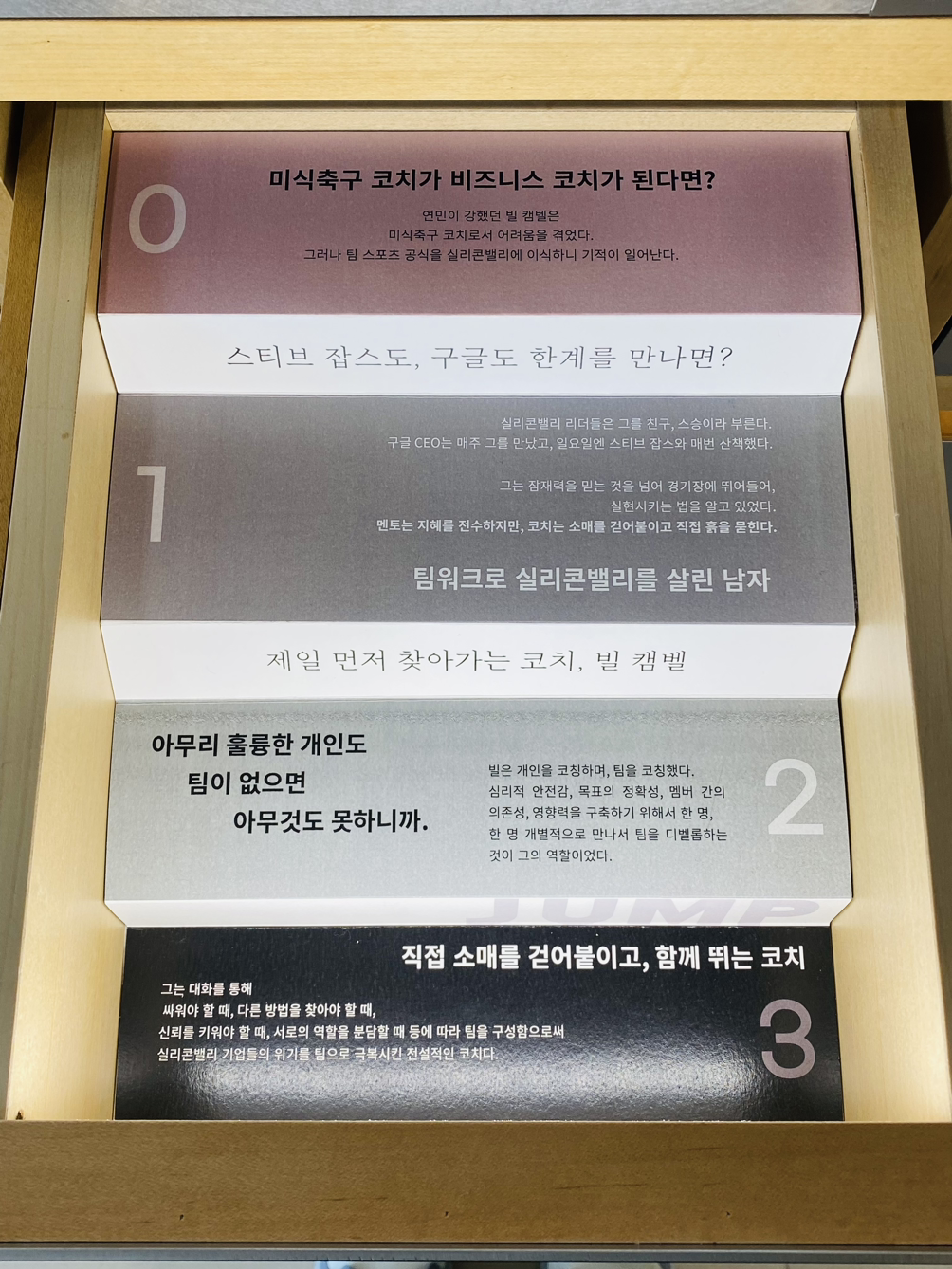 서랍을 한줄 한줄 열때마다 책의 요약 본을 보는 것 같았다. 예전에 하던일과 지금 하고 있는 일들이 이어지는 부분도 있고 또 완전 다른 것도 있기 때문에 지금 현재 상태로서의 일에 대한 깊은 울림보다 메세지를 풀어가는 방식이 인상 깊게 남았다.