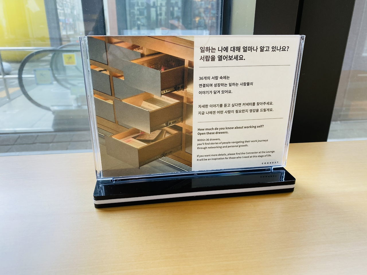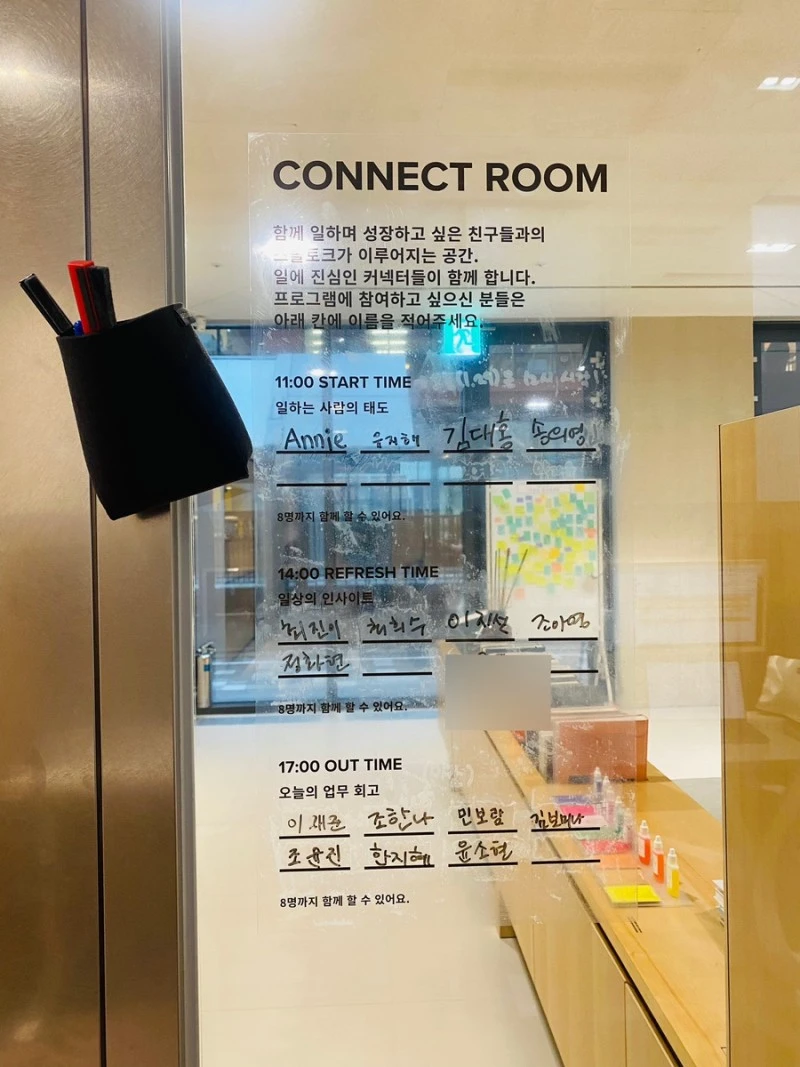 친근하게 이름을 부르며 인사를 건네주시던 커넥터 분들은 이 공간을 오픈하기 위한 프로젝트에 참여하셨던 분들이라 그런지 여기서 일하는 사람이라기 보다, 일에 대해 치열하게 고민하고 일을 더 잘하고 싶은 사람들을 위해 만든 이 공간과 닮은 사람이라고 생각됐다.