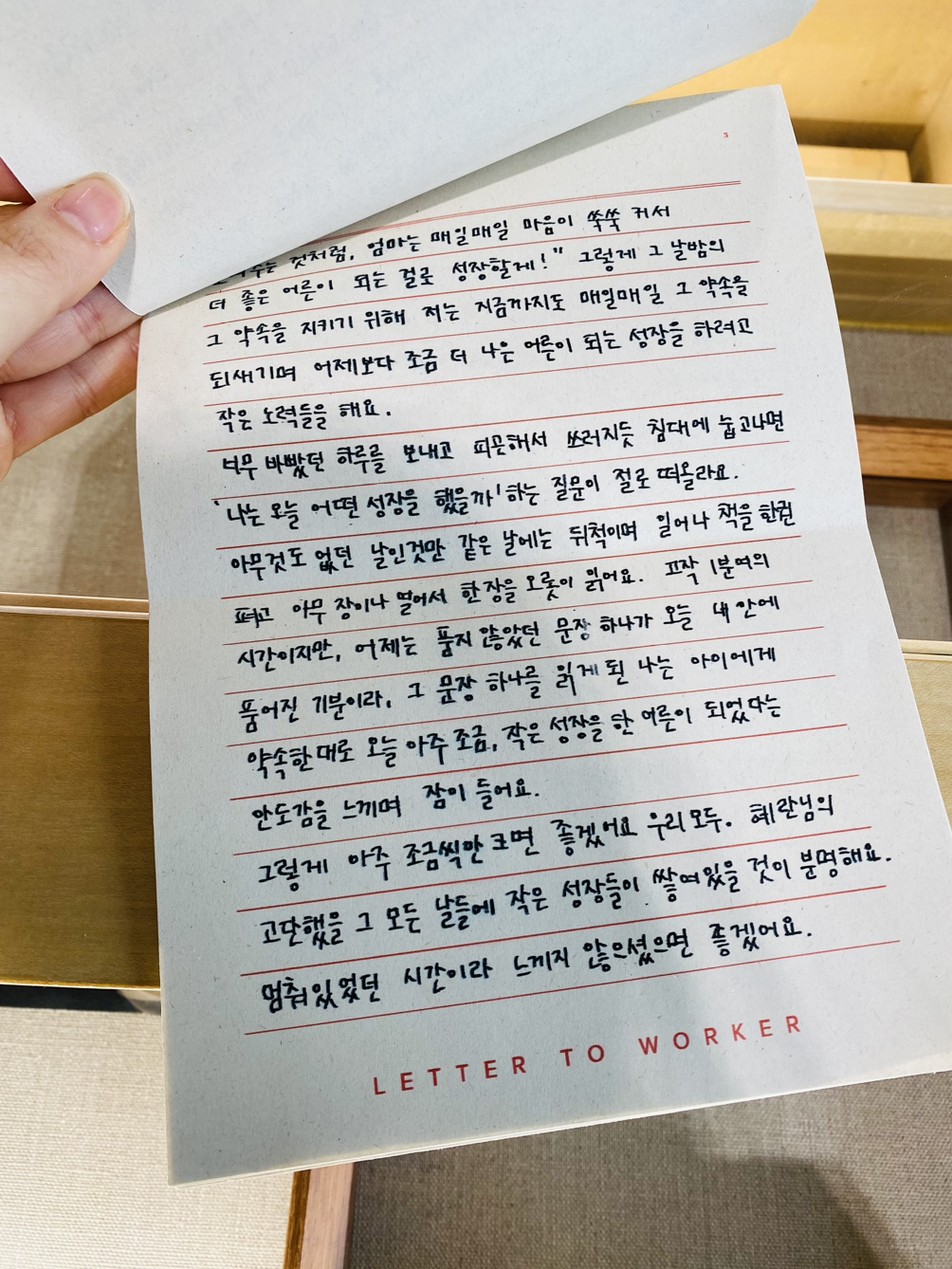 난 공통점이나 공감대가 없는 영역임에도 불구하고,누군가 나를 위해 어떤 말을 해줄 수 있을까 이런 저런 경험들을 골라 진심 다해 써준게 느껴져서 주책스럽에 눈물이 찔끔 날뻔했다.