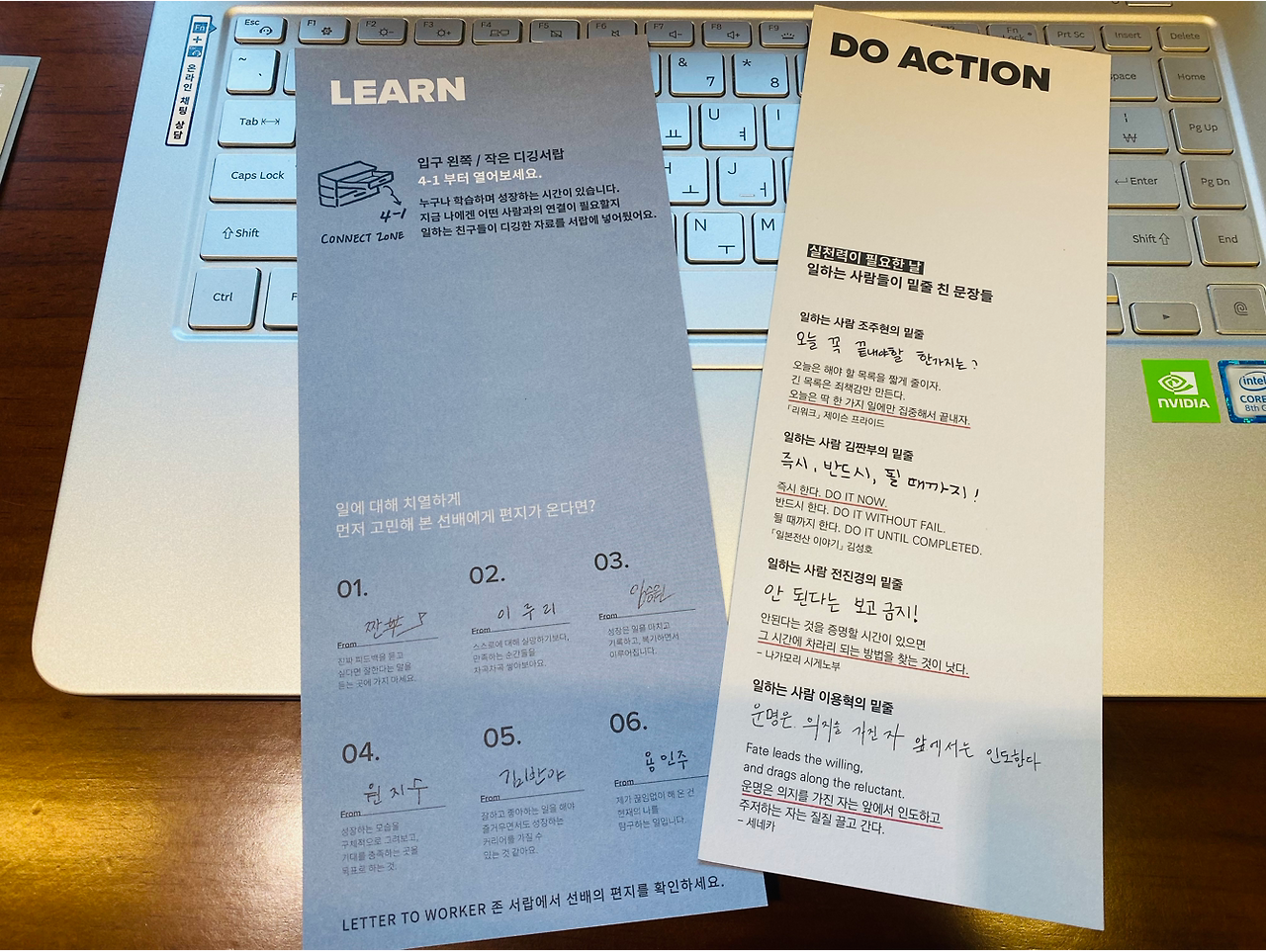 나는 DO ACTION(추진, 실행력)과 3-5년차 LEARN을 골랐는데 거기에 맞는 짧막한 문장들이 공감과 좋은 자극이 됐다.