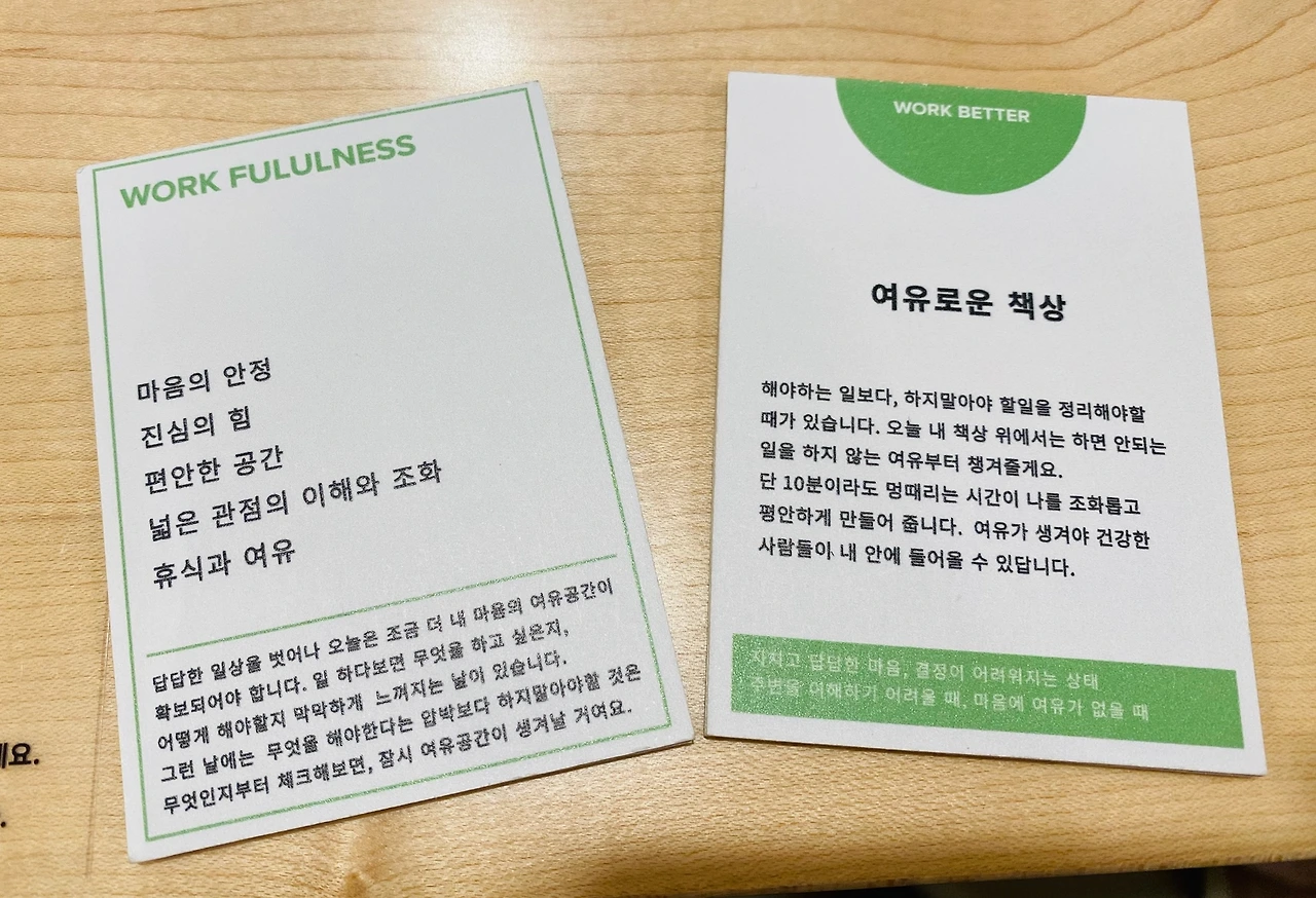 어제 데스커라운지에서 같은 공간에서 일하는 분들과 약간의 스몰톡을 할 수 있게 만들어 놓은 프로그램에 참야해서 뽑은 메세지 카드인데