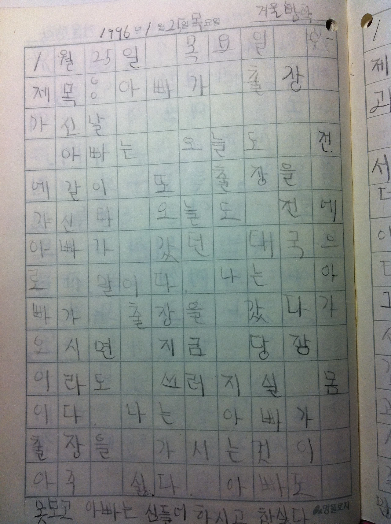 아빠가 출장 가시는 게 너무나도 싫은 1학년 딸의 마음이 잘 표현되어있는 일기다. 어린 나의 표현력도 흥미롭다.