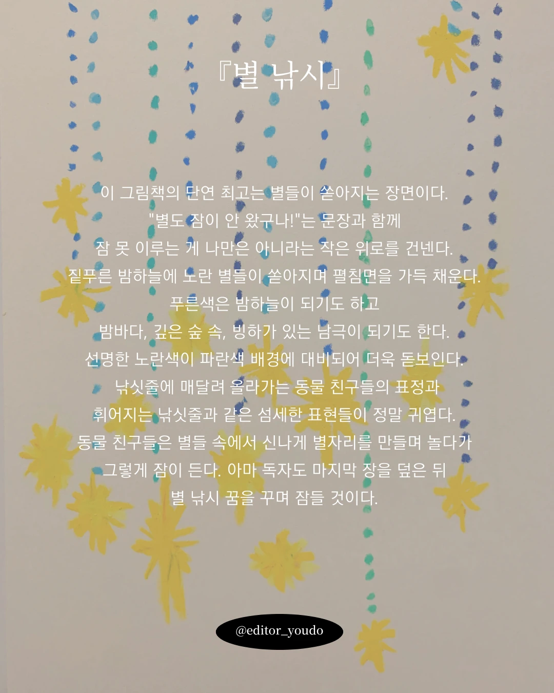 짙푸른 밤하늘에 노란 별들이 쏟아지며 펼침면을 가득 채운다.