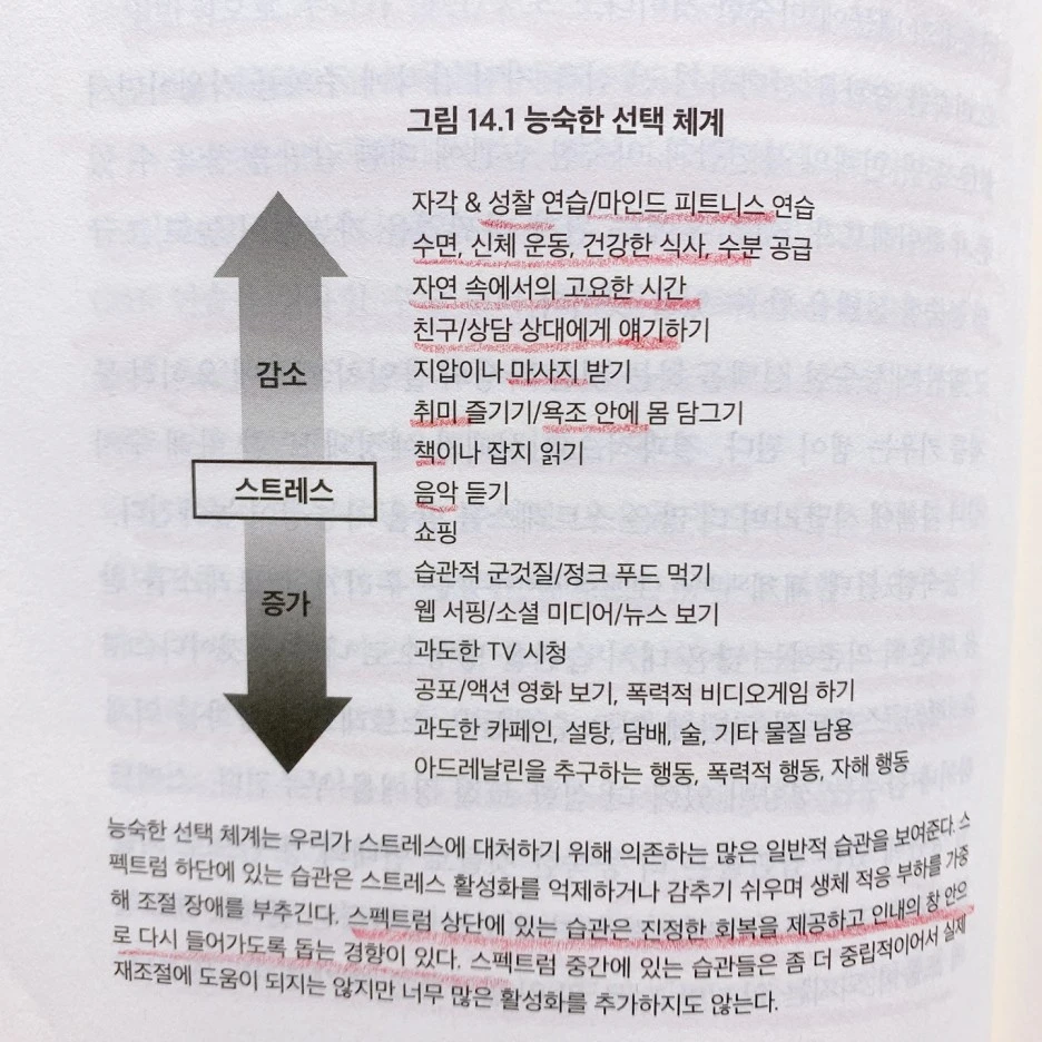 시간이 지날수록 만성 스트레스로 인내의 창이 좁아지면 악순환이 시작된다. 미루기와 무리해서 일하기 사이를 오가는 패턴을 반복하게 된다. 처음에는 지쳤다고 할 일을 미루고 나중에 무리해서 일을 해야 한다. 만성 스트레스를 받으면 주의의 초점이 '급한 불 끄기'와 당장 눈앞의 일 처리하기로 좁혀진다. 진정으로 중요한 일보다 급한 일에 잘못 우선순위를 둔다. 나도 이런 경험들이 있기에 뜨끔 하는 순간이었다. 생활방식의 선택은 어디까지나 우리에게 달려있다. 자기 조절과 회복에 도움 되는 생활방식을 선택하도록 우선순위를 두고 실천하려면 의도적 노력이 필요하다.