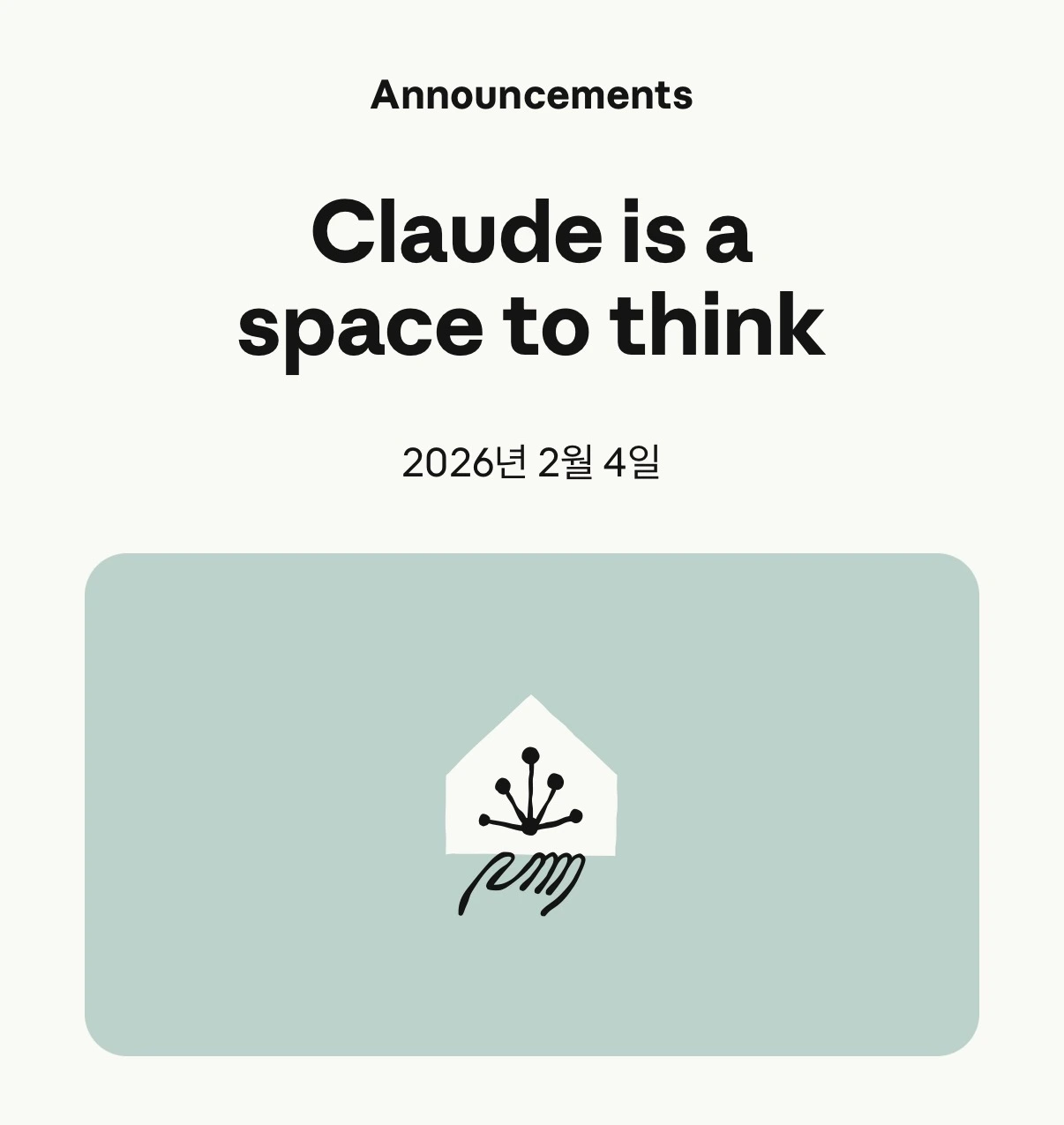 Anthropic은 어젯 밤, "Claude is a space to think"라는 제목의 글을 발표했다. 첫 문장이 인상적이다.