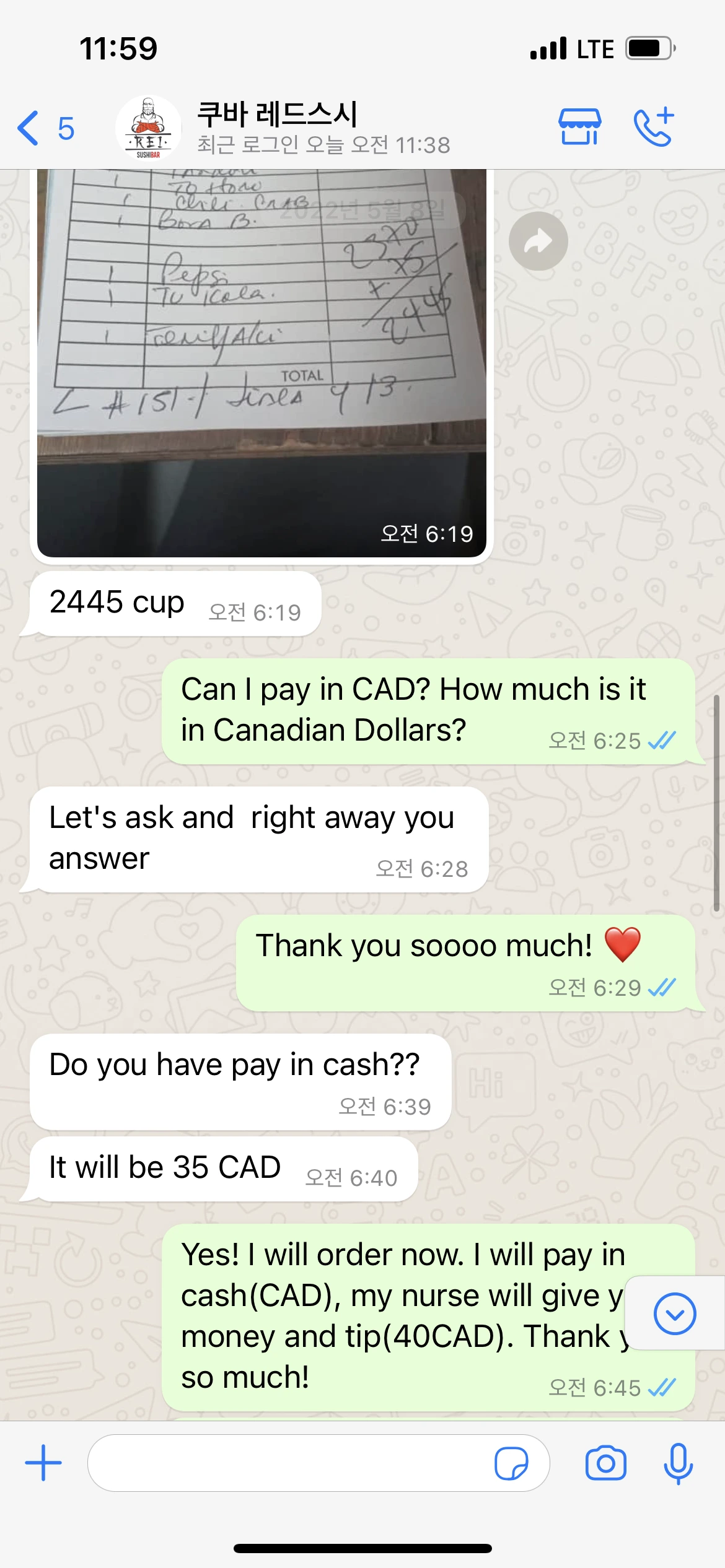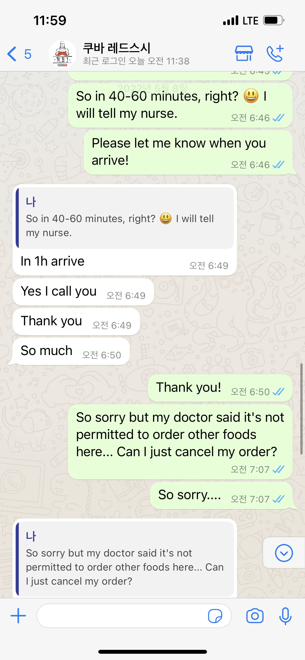 나는 당장 레드스시에 연락을 해서, '다시 주문해도 될까요? 아래 도착하면 전화 주세요. 유데이시라는 간호사가 내려가서 돈을 낼 거예요. 너무 감사해요! 저 스시가 너무너무 먹고 싶거든요...'라는 문자를 보냈다. 답변은 'Ok Perfect!'