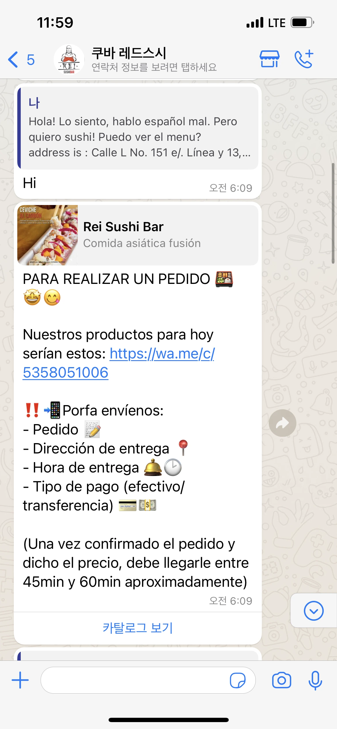 떨리는 마음으로 왓츠앱을 켜서, 메뉴를 볼 수 있는지부터 확인했다. '안녕하세요, 죄송하지만 제가 스페인어를 잘 못 합니다. 그래도 스시를 먹고 싶어요! 메뉴를 볼 수 있을까요?'라고 물어본 후, 배달이 가능한지 확인하기 위해 병원 주소를 보냈다. 왓츠앱의 자동 응답 기능으로 메뉴는 보내자마자 받아 볼 수 있었다.