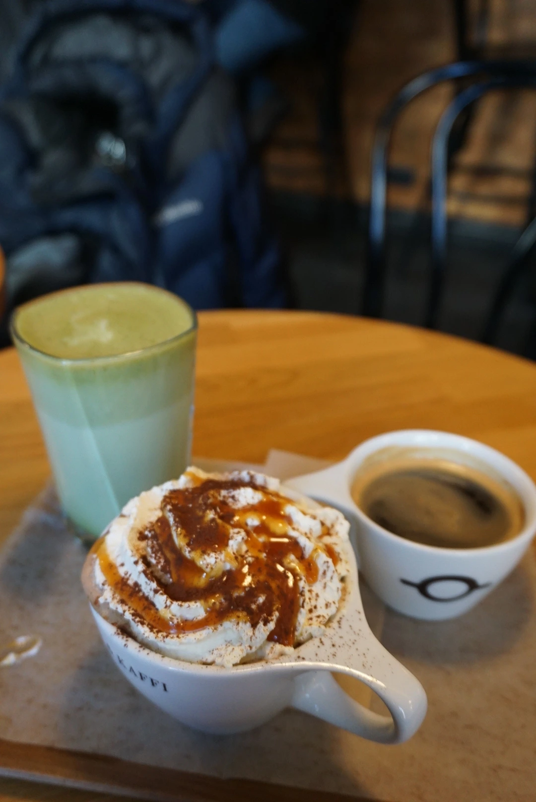핫도그 하나 먹고 약간 추워질 때 들어갔던 커피샵. 아메리카노와 말차 라떼, 크림을 얹은 카라멜 커피를 주문했더니 3만 원이 넘는다! 성수 핫플 카페 가격의 1.5배 정도라고 생각한다면 나쁘지 않아 보이기도. 말차 라떼는 그렇게 달지 않아 좋았고 카라멜 커피는 혈당 스파이크 오는 맛이었다. 그래도 이런 달달함이 필요했다!