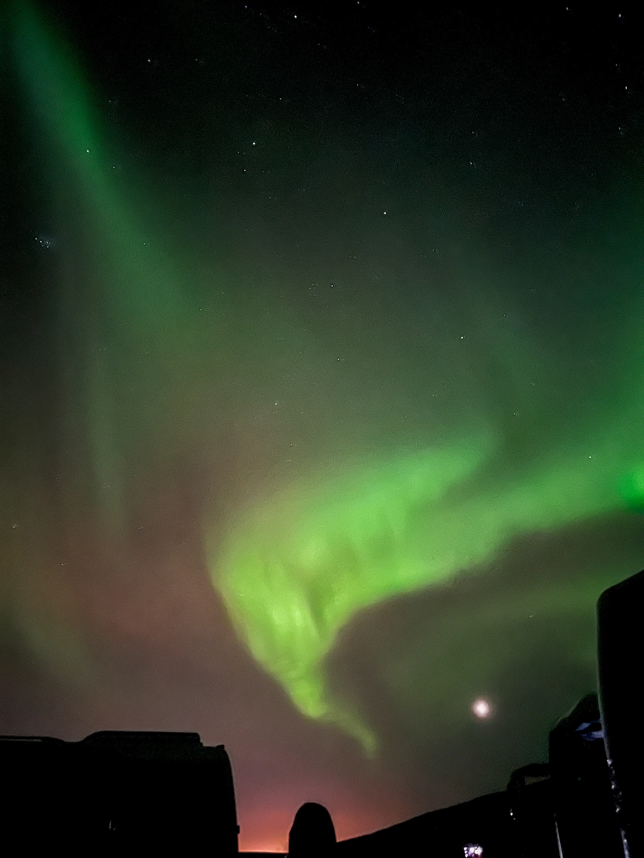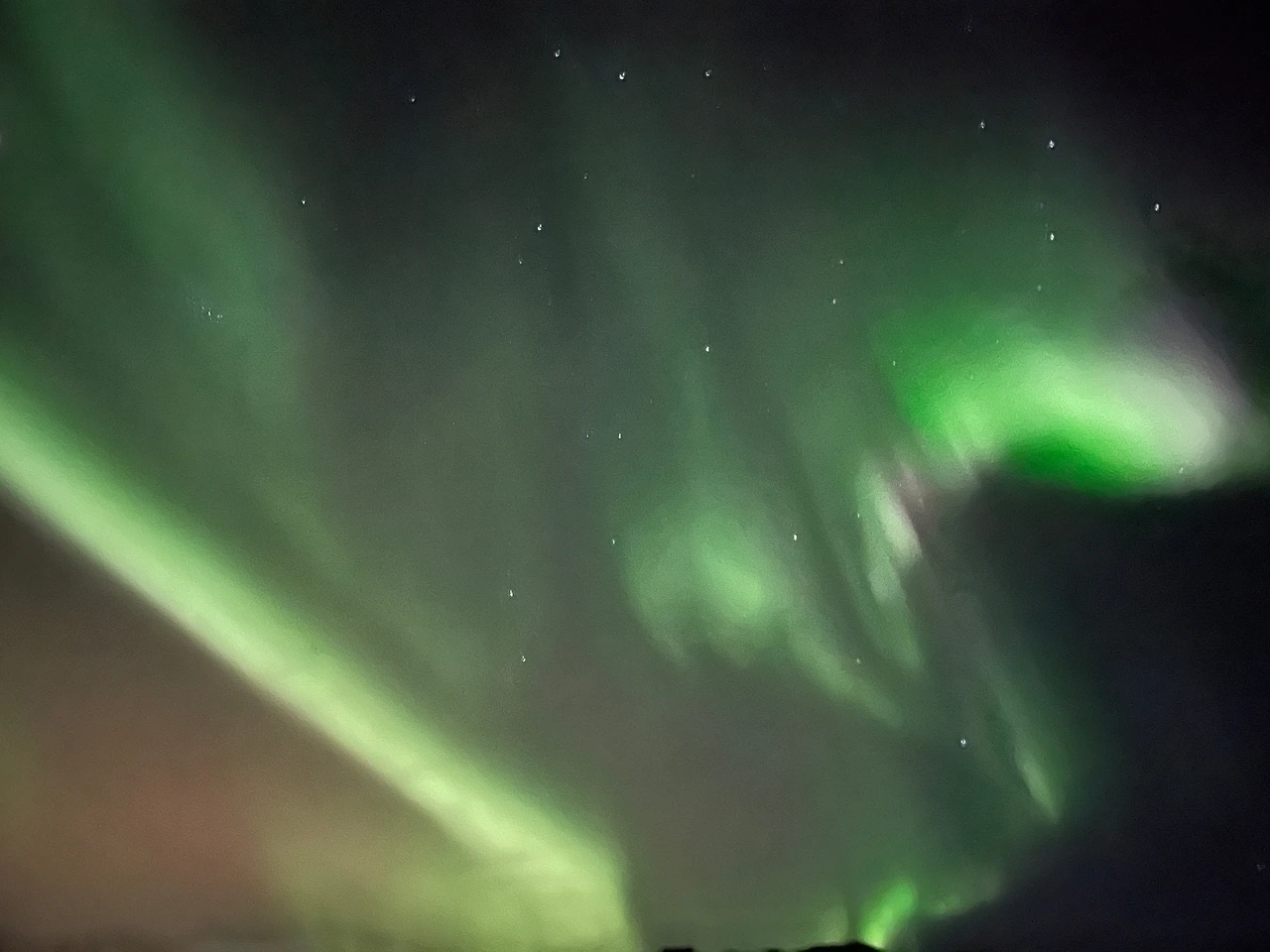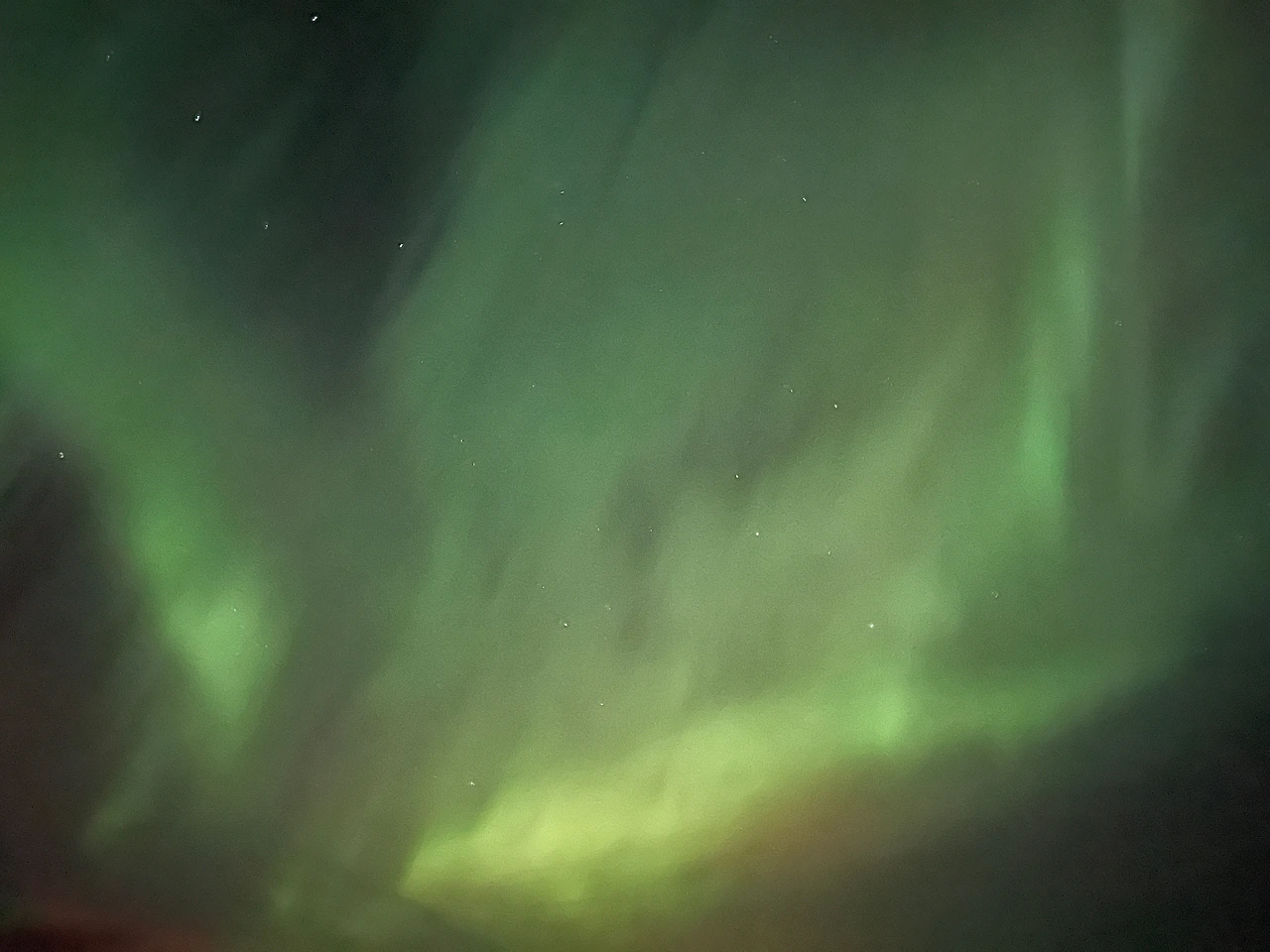 하늘 전체에 길게 펼쳐진 오로라를 볼 수 있다는 것이 감격스러웠다. 처음에는 세 줄기로 거대한 커튼이 만들어졌다가, 점점 합쳐지며 소용돌이가 되기도 했고 중간중간 붉은빛이 섞이기도 했다.