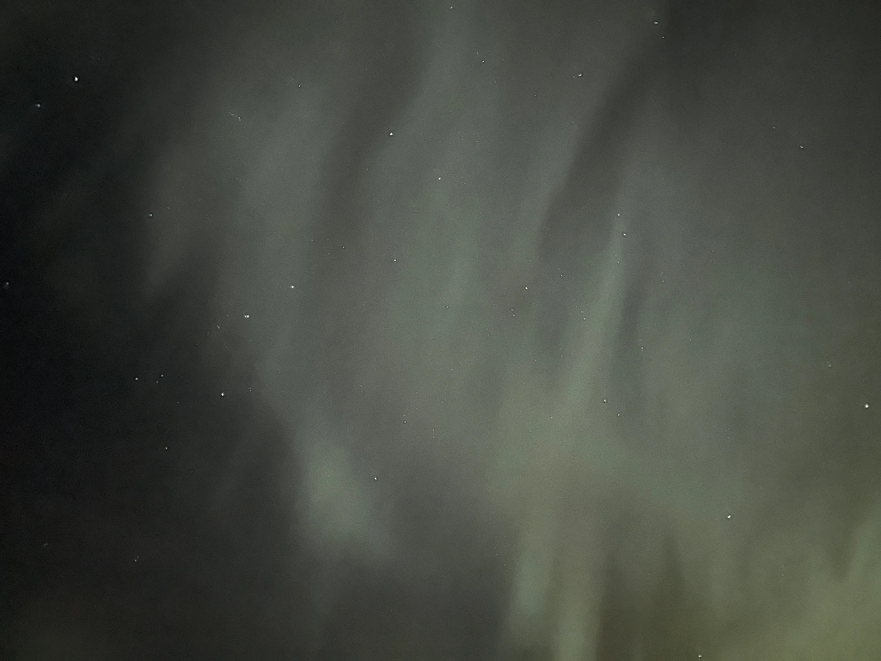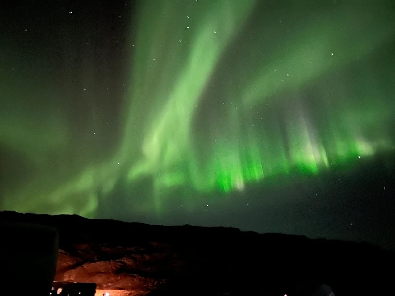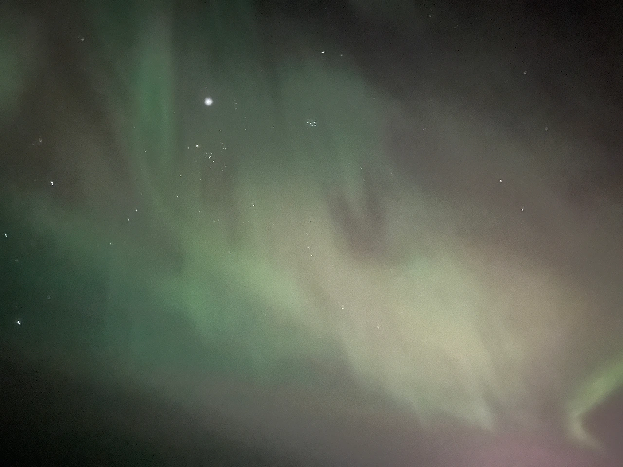 하늘 전체에 길게 펼쳐진 오로라를 볼 수 있다는 것이 감격스러웠다. 처음에는 세 줄기로 거대한 커튼이 만들어졌다가, 점점 합쳐지며 소용돌이가 되기도 했고 중간중간 붉은빛이 섞이기도 했다.