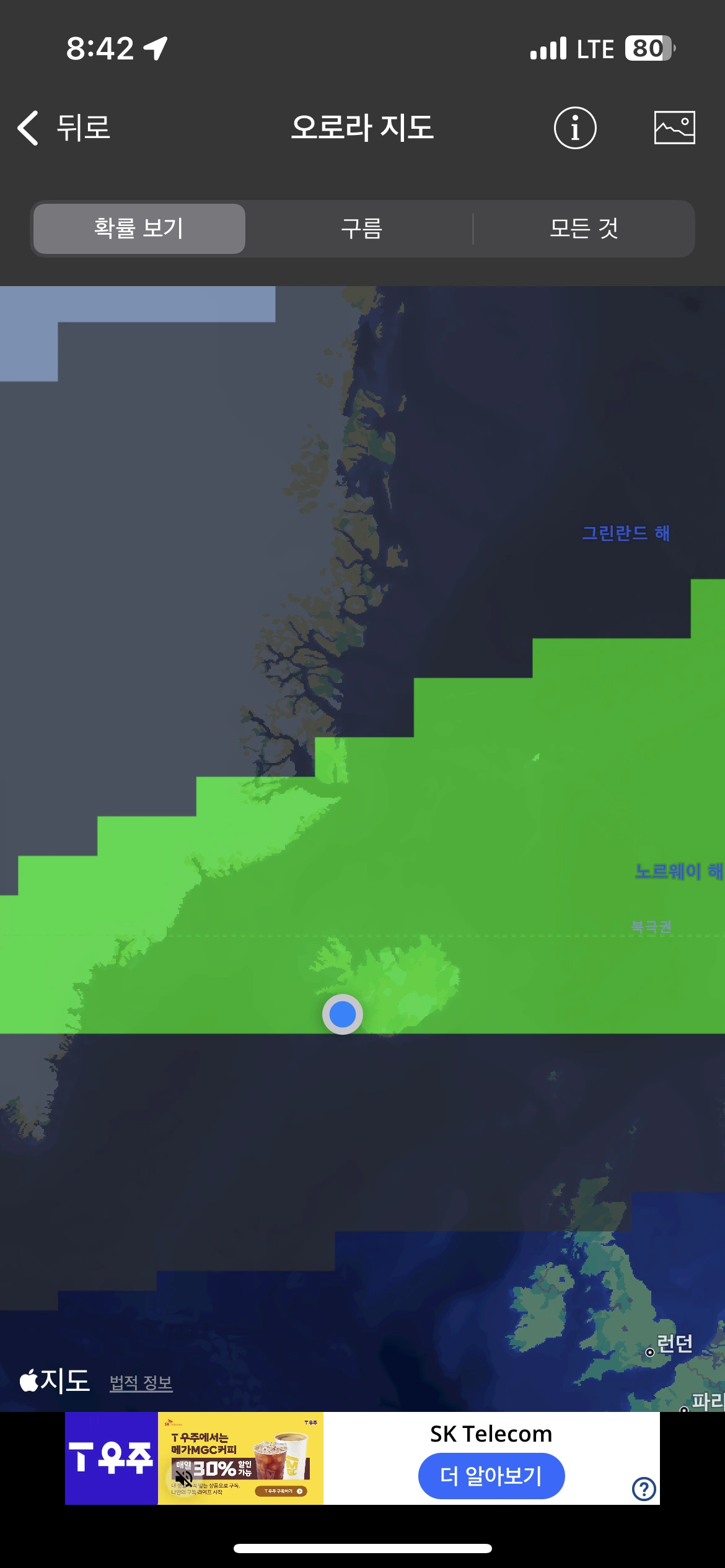 오로라를 볼 수 있는 기회는 생각보다 정말 빨리 찾아왔다. 도착한 첫날 하늘은 구름 한 점 없이 맑았고, 아빠는 그날 저녁 8:30에 떠나는 오로라 투어를 예약하셨다. 다만 걱정인 것은 오로라 지수였는데, 기대 지수가 KP3 정도로 높지 않았다(KP9가 가장 높은 지수).